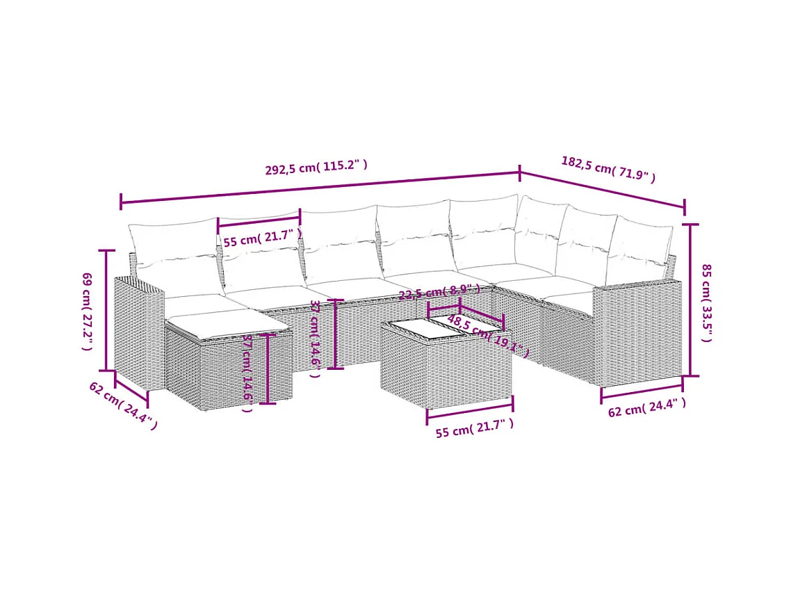 Salon de jardin 8 pièces avec coussins marron résine tressée