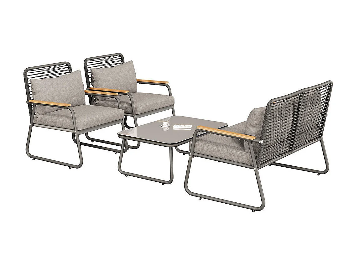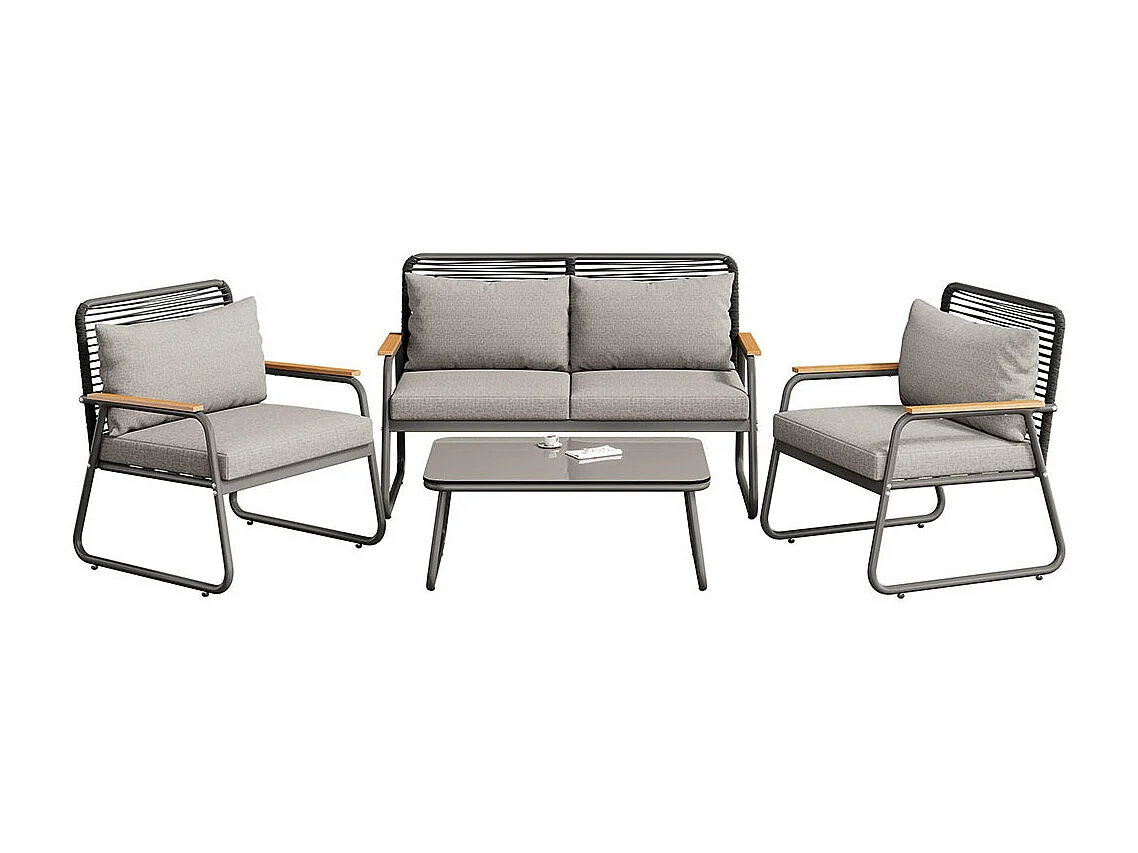 Salon de jardin avec structure en fer galvanisé, plateau de table en verre trempé, pieds de table réglables avec siège et coussins, gris