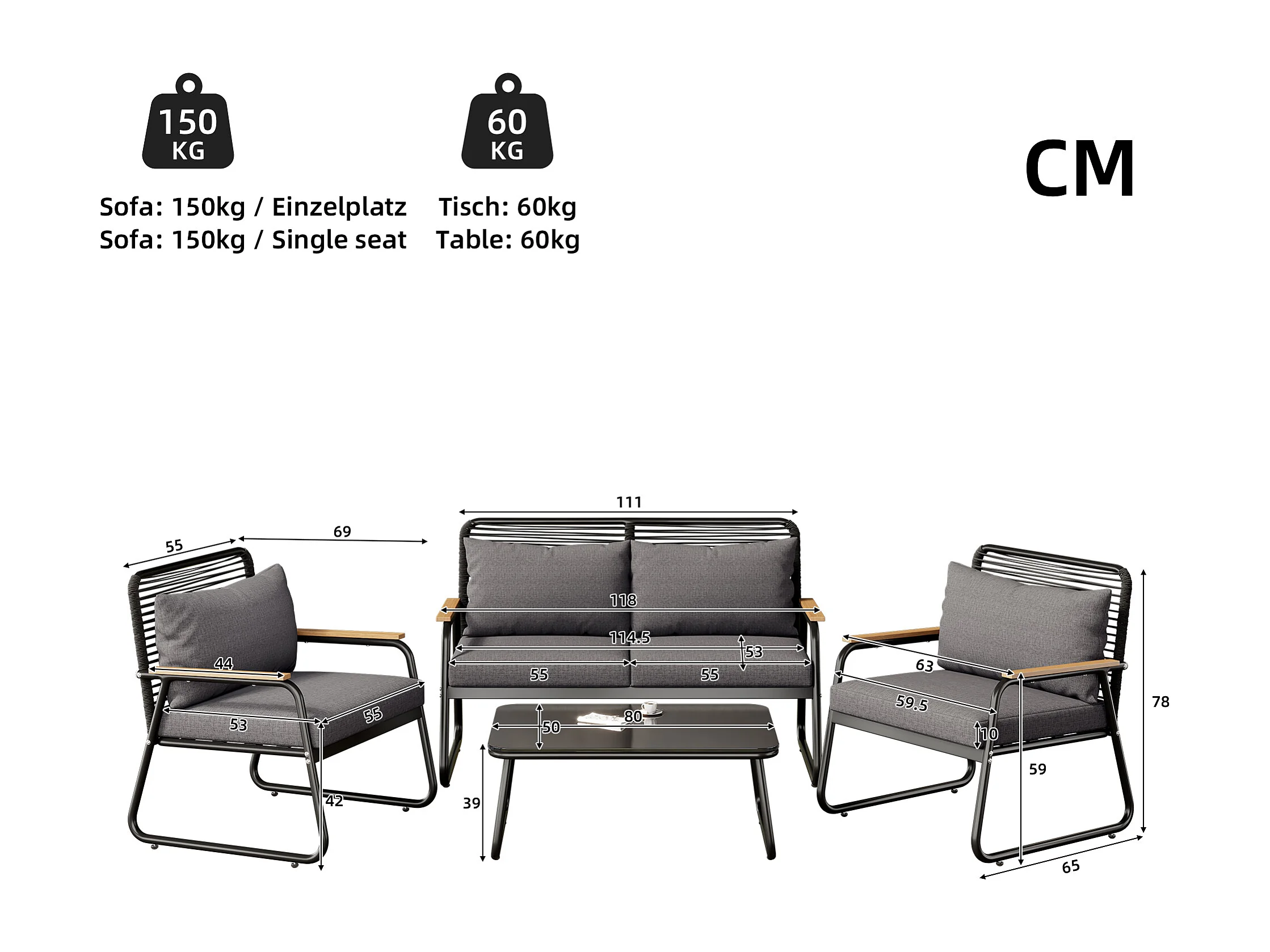Salon de jardin 4 places, canapé 118x65x78 cm, pieds réglables, plateau en verre trempé, coussins inclus, métal polyester noir