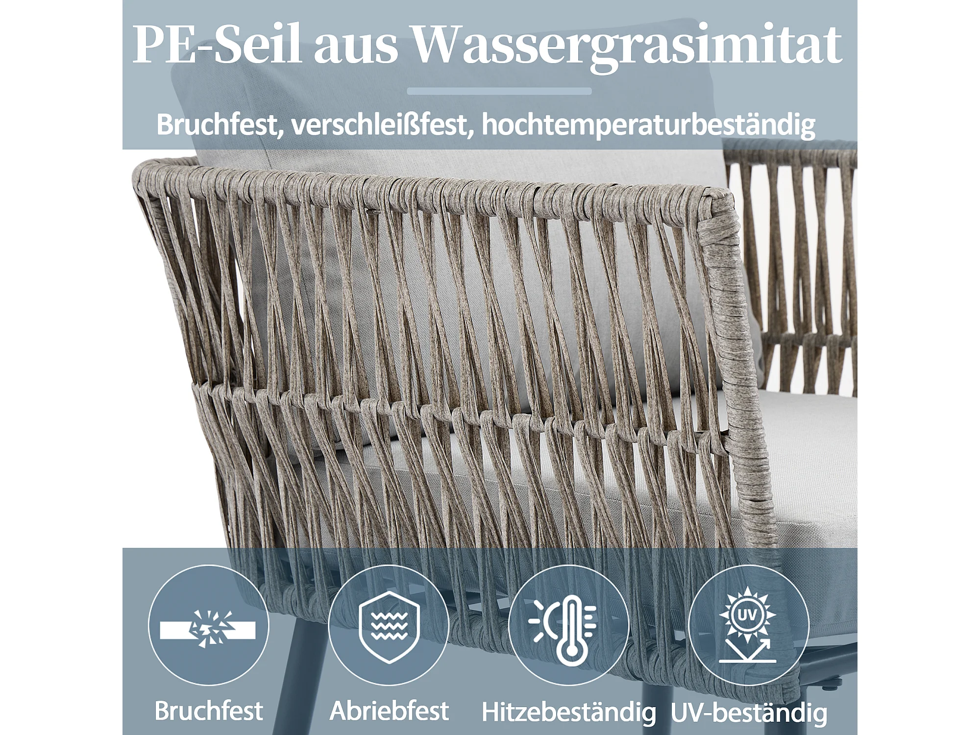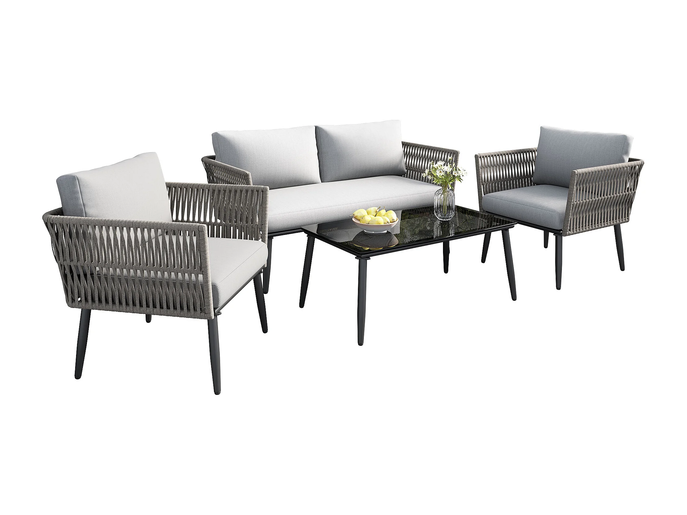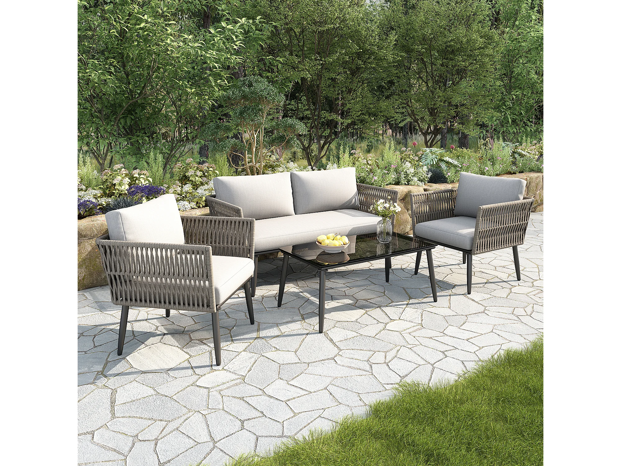 Salon de jardin, canapé d'angle, fauteuil, table basse, acier galvanisé, bois d'acacia, gris (dimensions sur image)