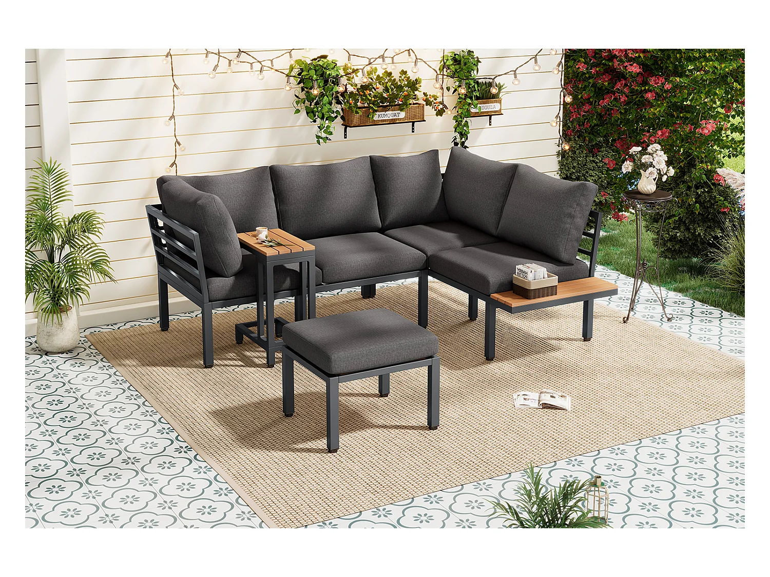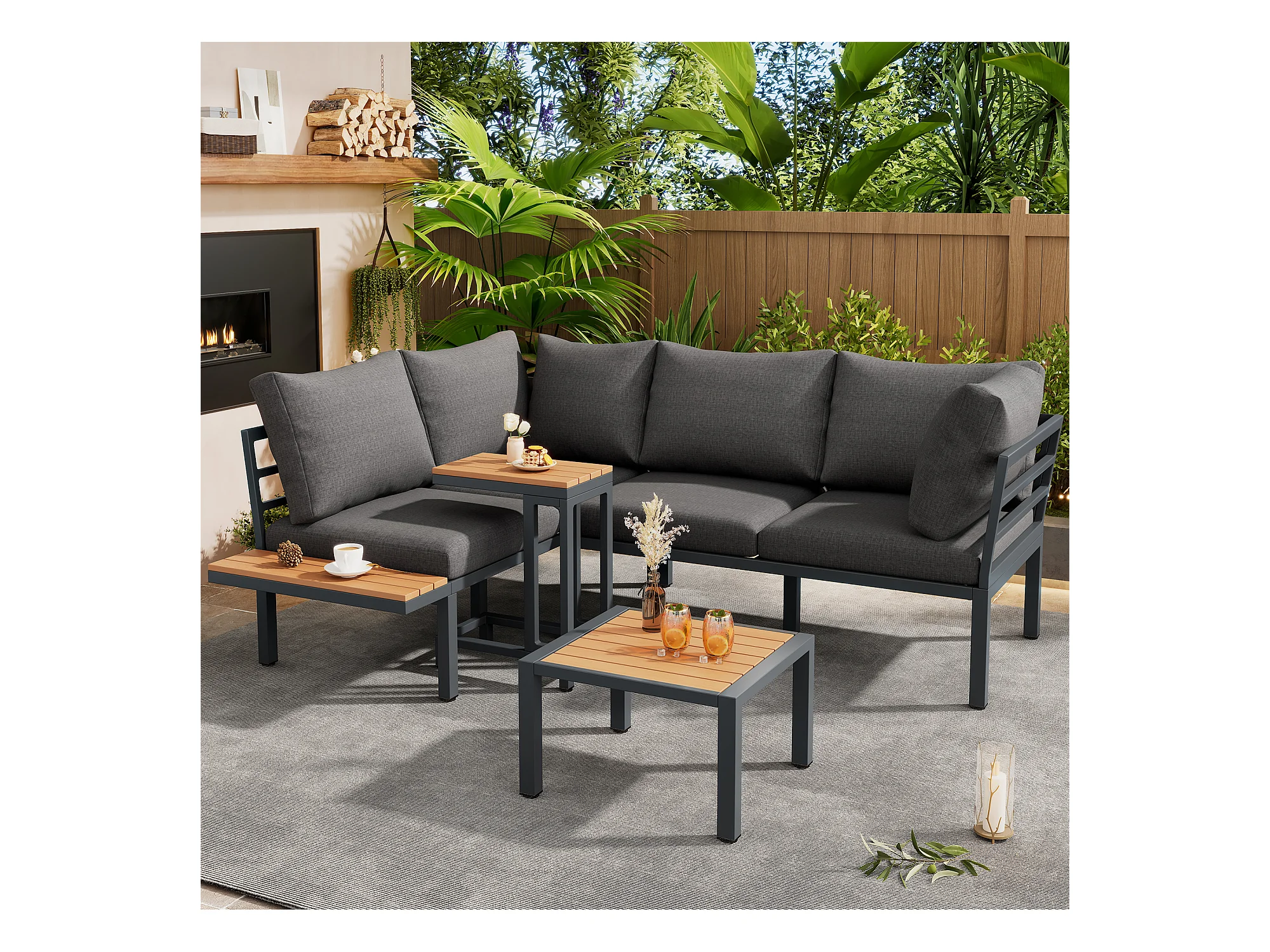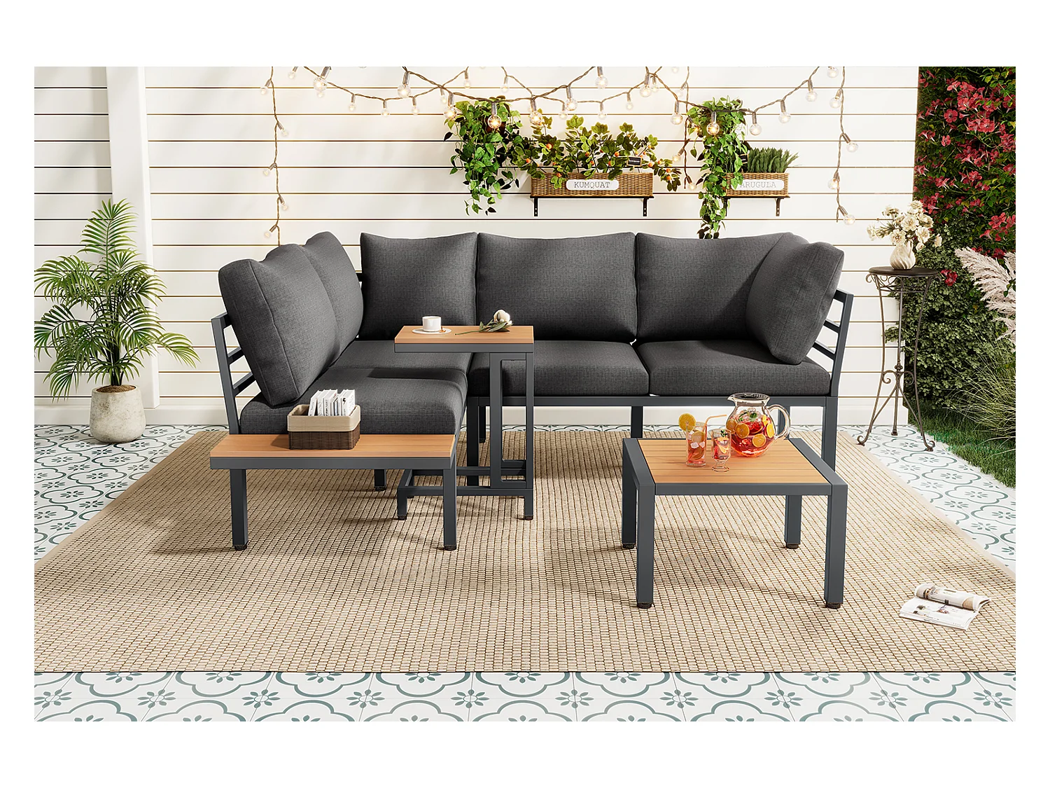 Salon de jardin d'angle en acier galvanisé : 2 canapé 2 places + 1 table basse + 1 table d'appoint - Gris + noir