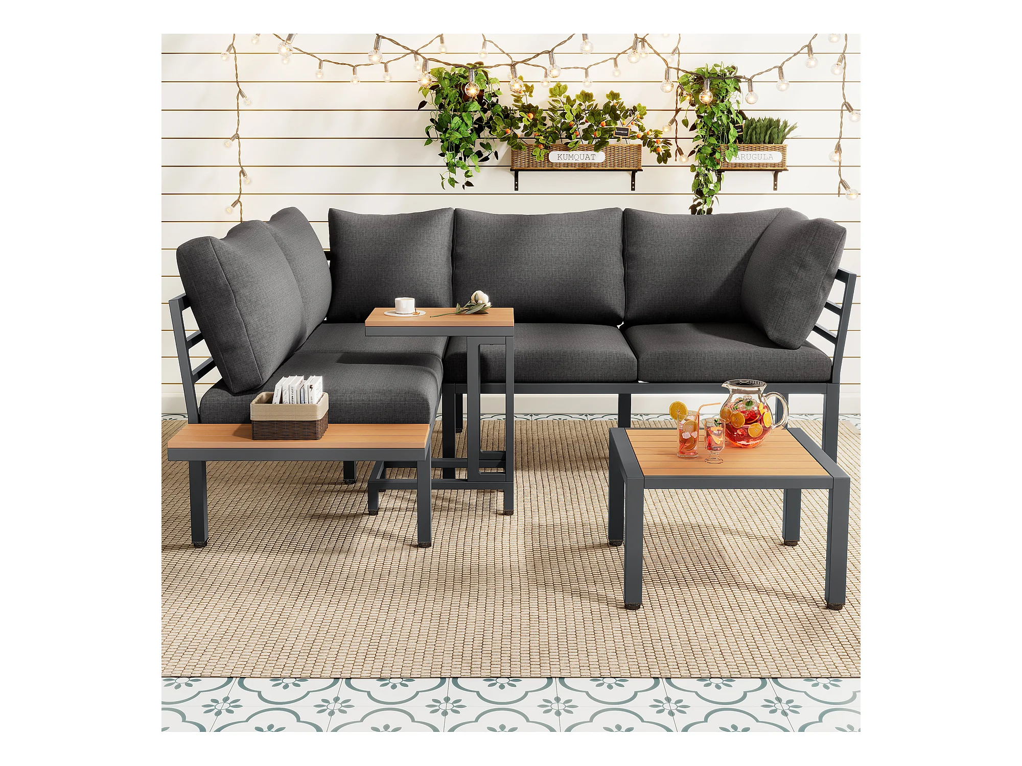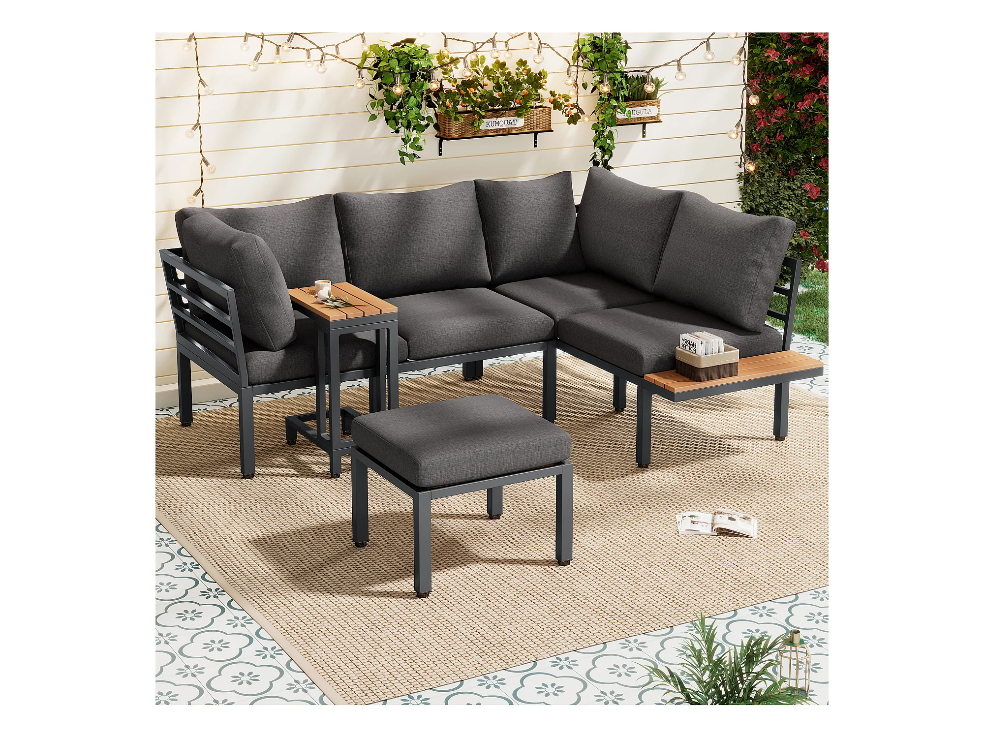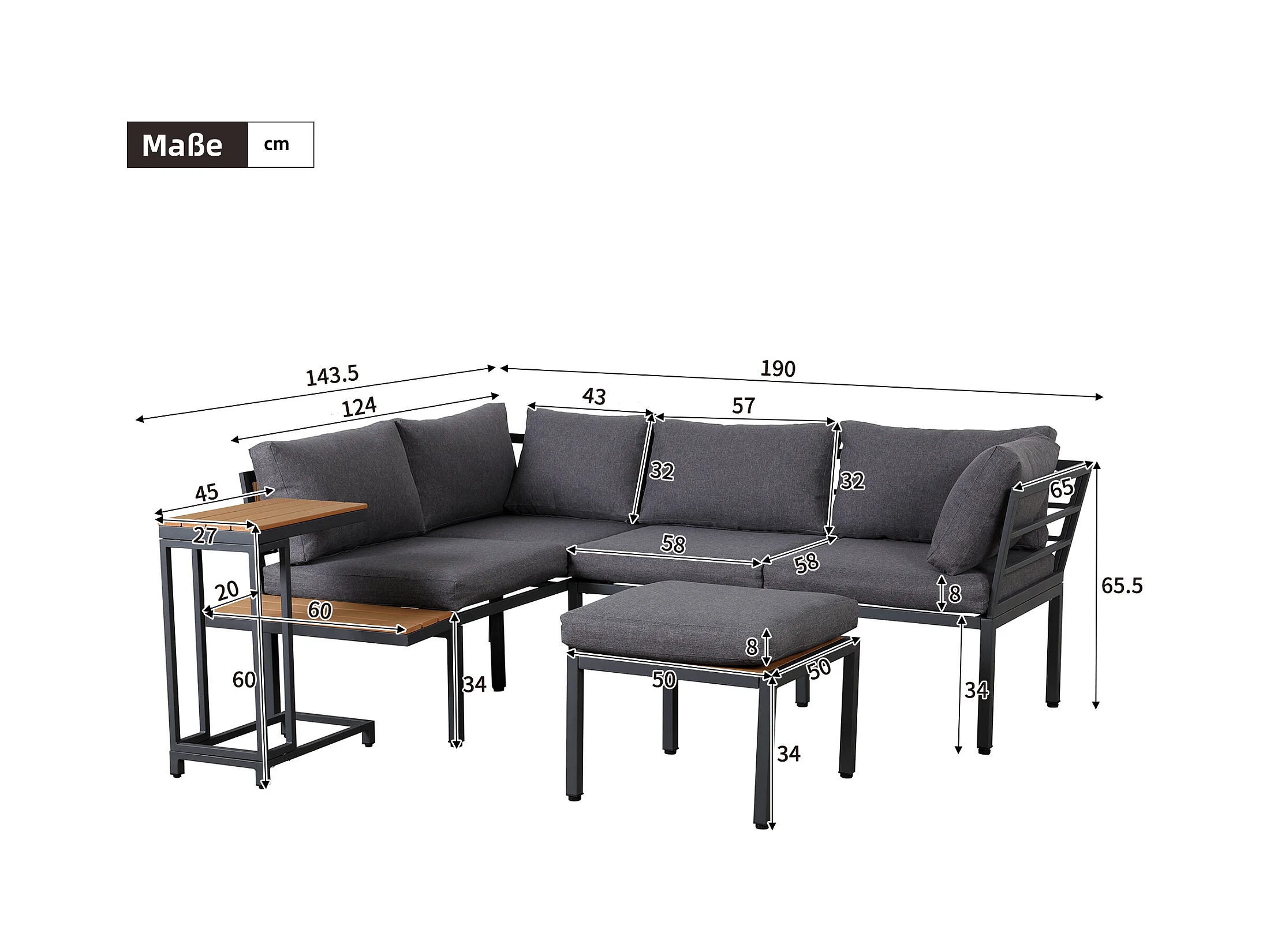 Salon de jardin d'angle en acier galvanisé : 2 canapé 2 places + 1 table basse + 1 table d'appoint - Gris + noir