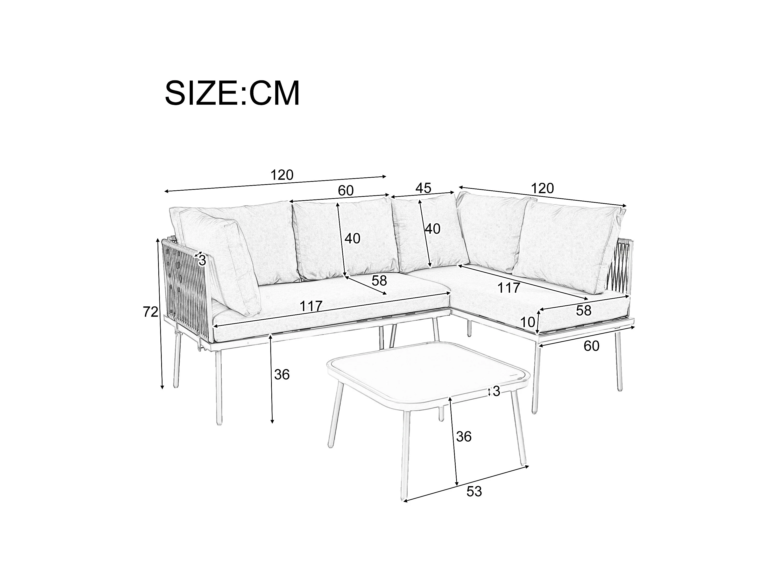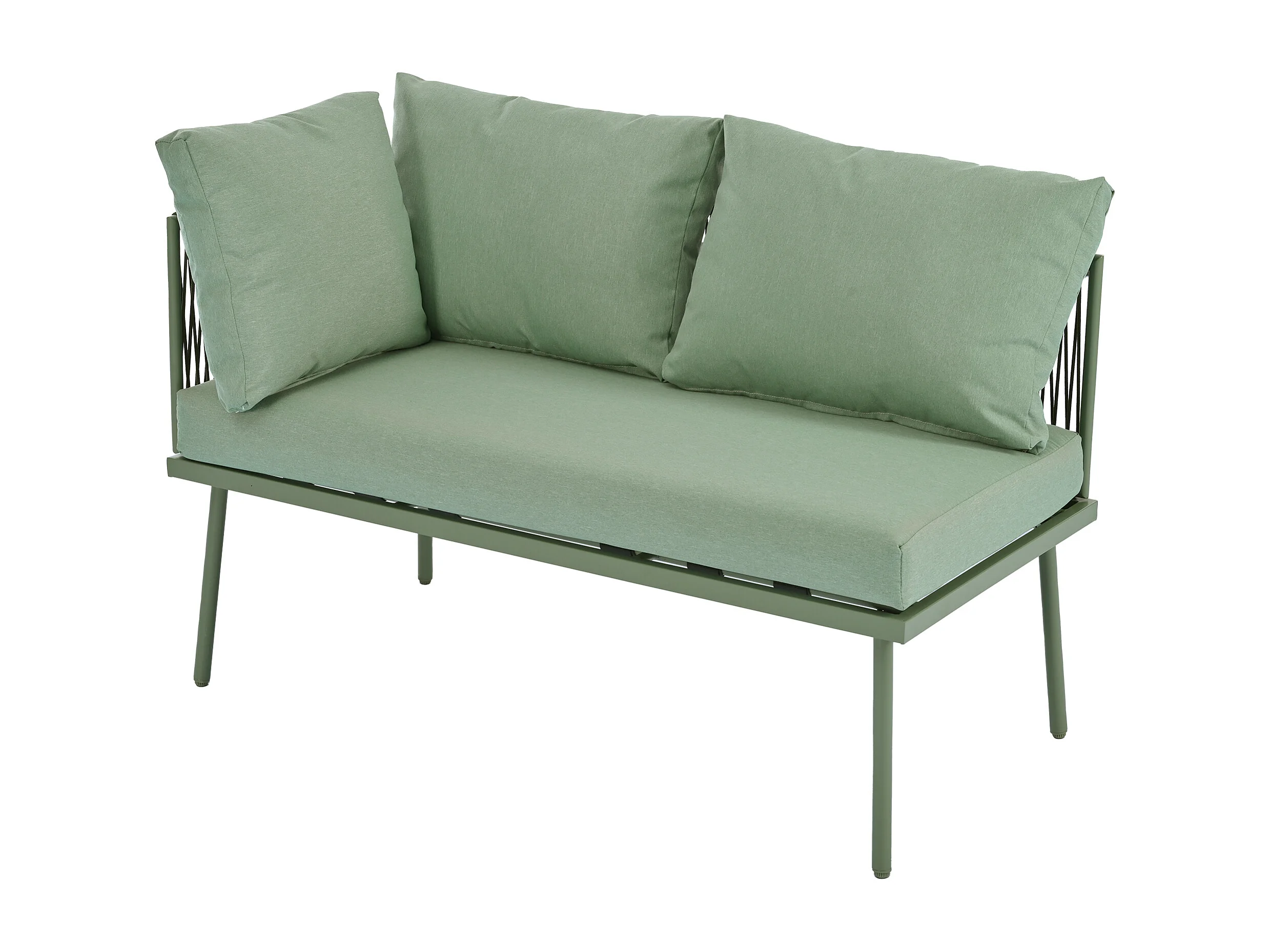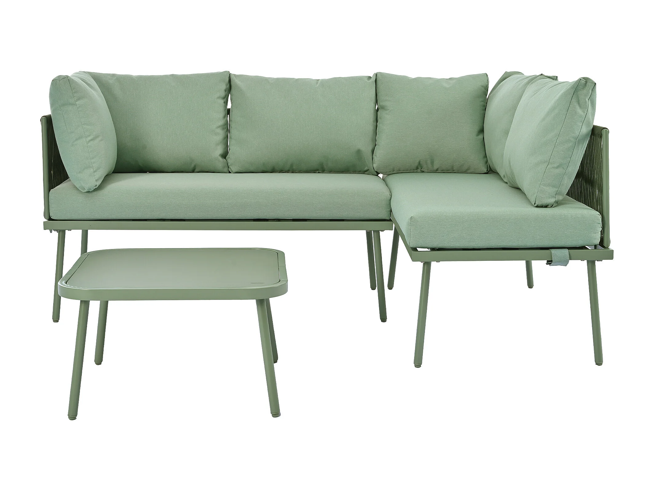 Salon de jardin d'angle grand confort 4 places - 2 canapés et 1 table basse + 8 coussins d'assise et de dossier - fer et corde - vert