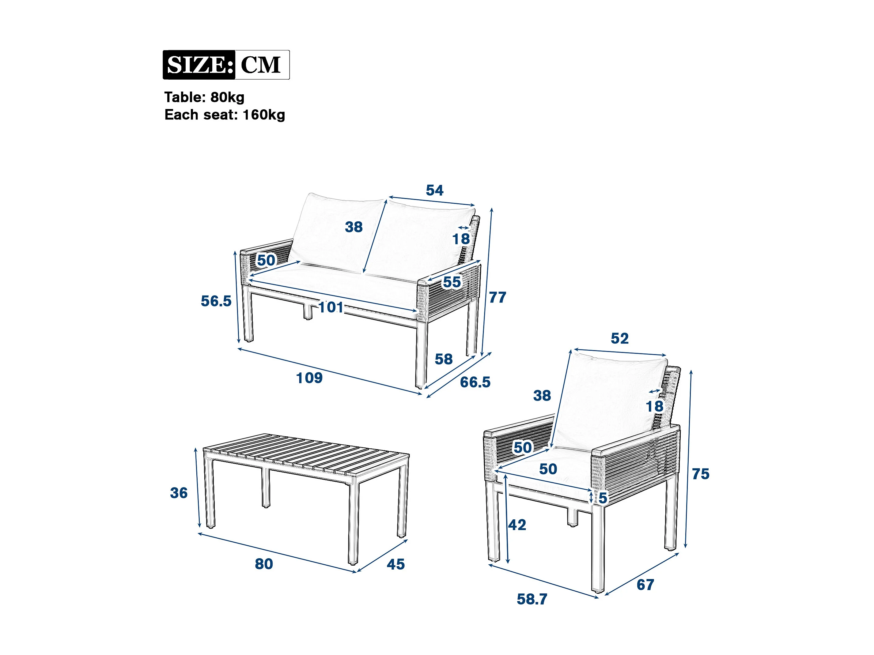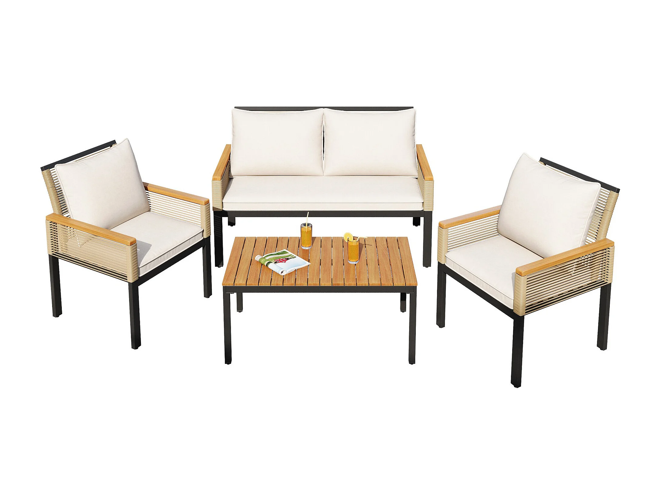 Salon de jardin en acier 4 places- 2 fauteuils et table basse - en corde tressée et bois d'acacia - Beige