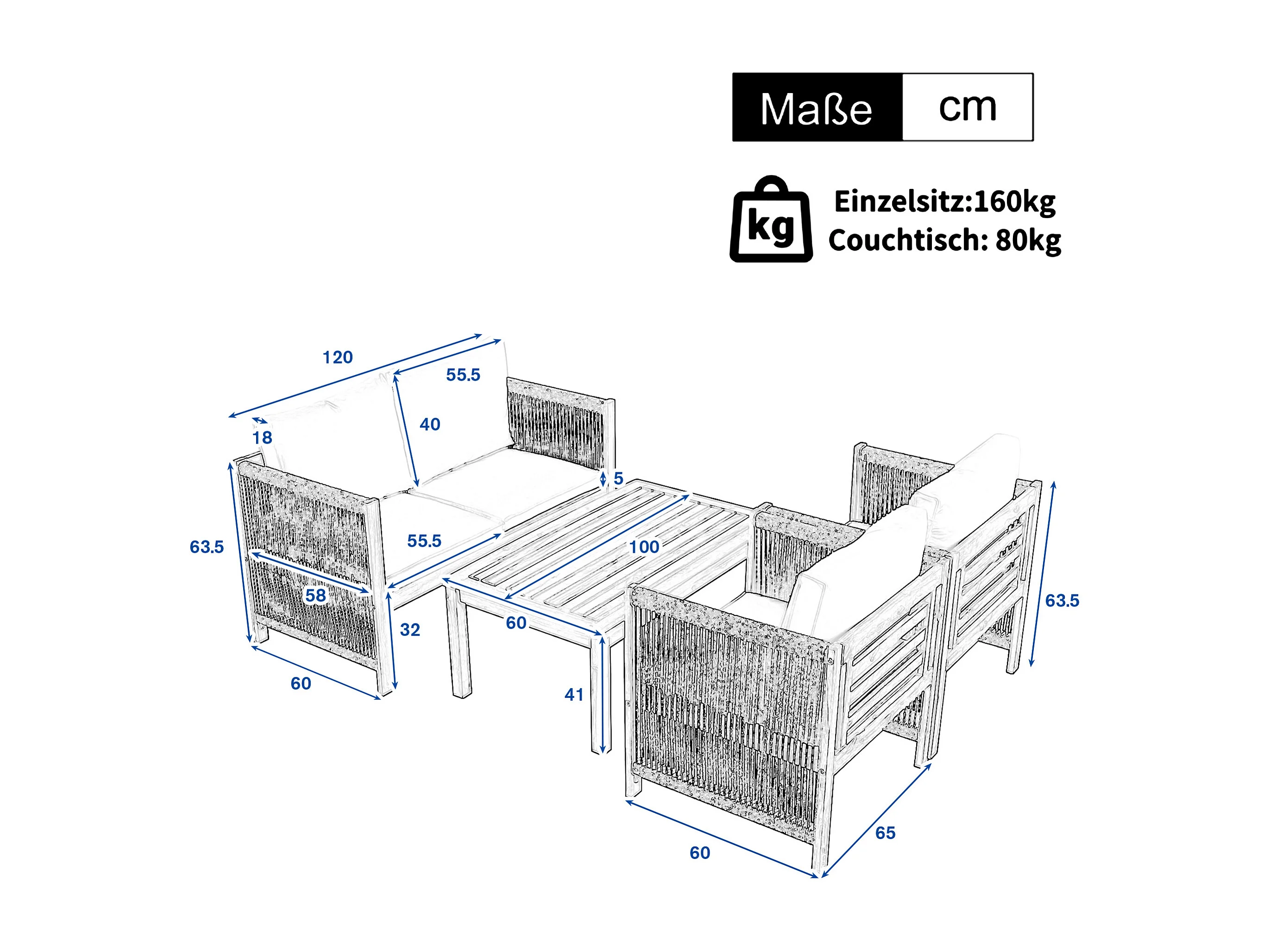 Salon de jardin en acier 4 places - canapé、2 fauteuils et table basse - en corde tressée et bois d'acacia - Beige