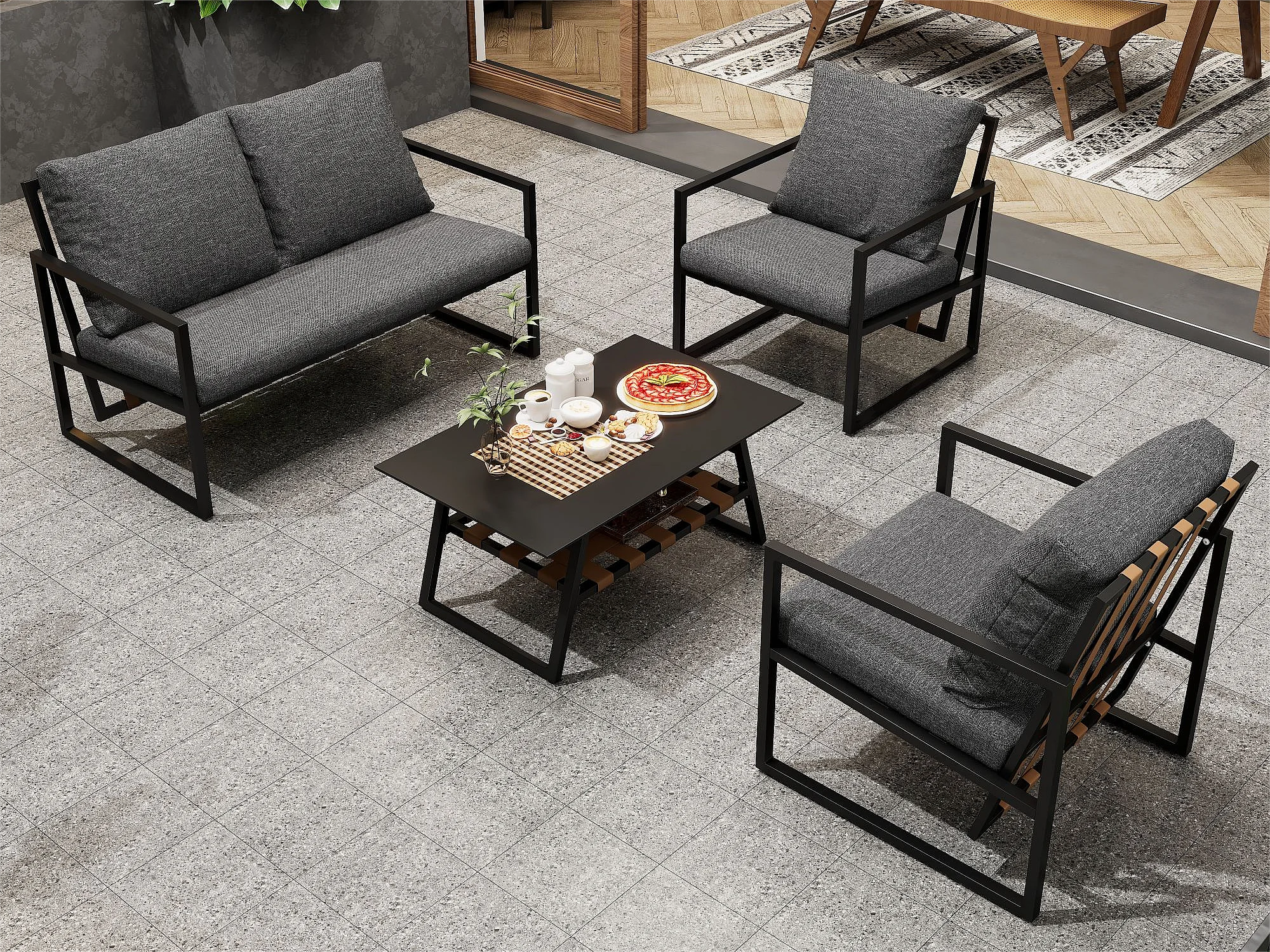 Salon de jardin en acier galvanisé 4 places : 1 canapé + 2 chaises + 1 table basse avec 2 étagères - 7 coussins d'assise et de dossier - Noir