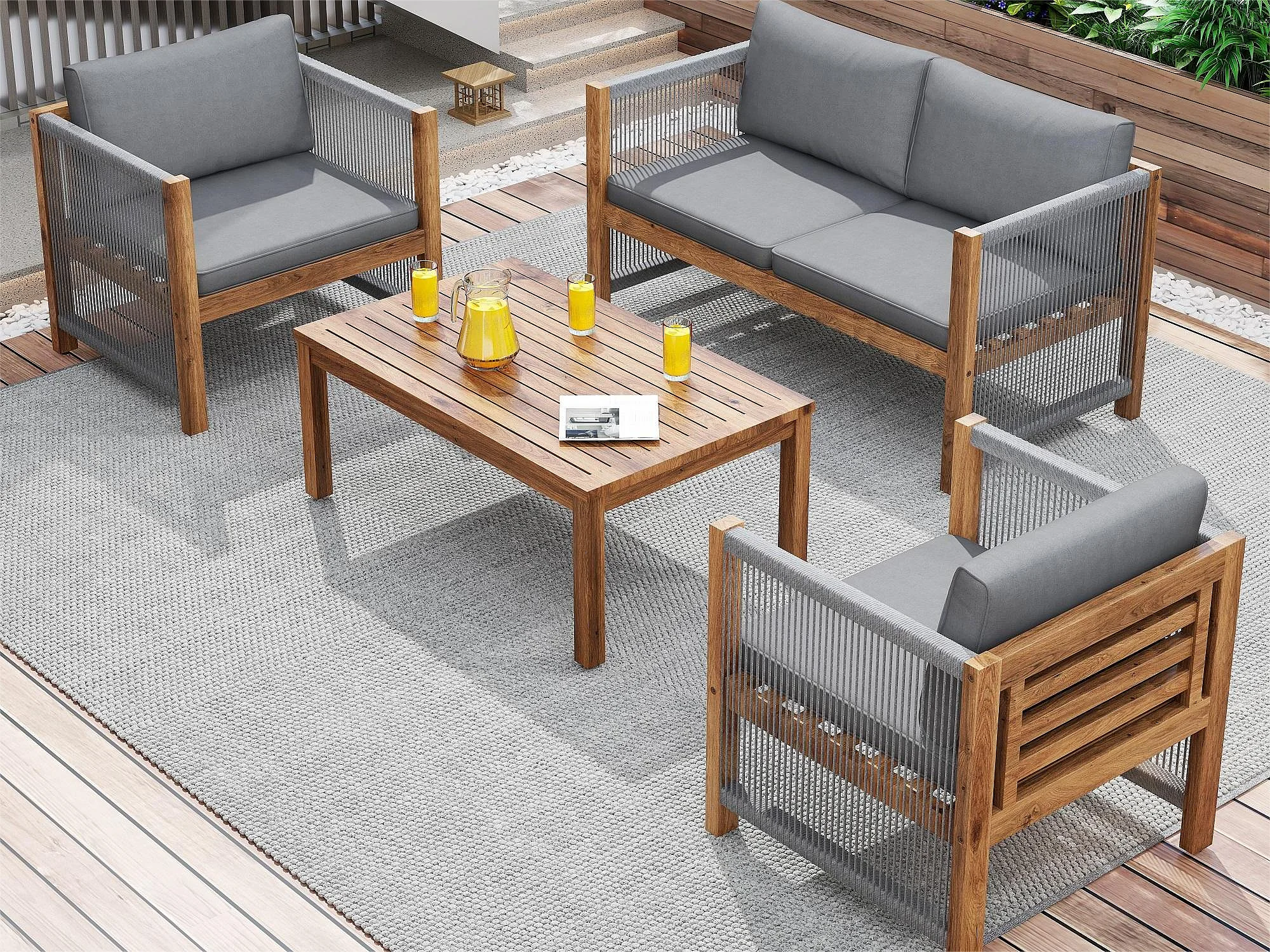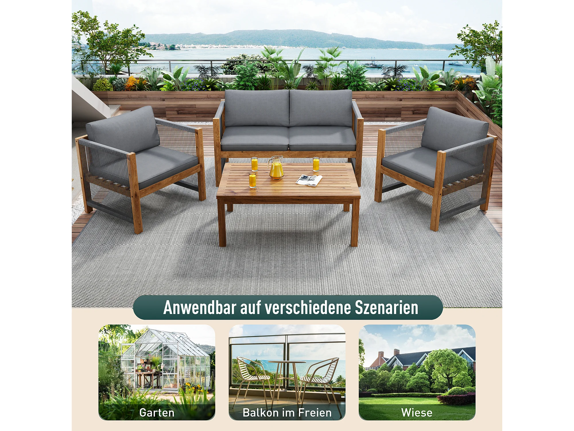 Salon de jardin modulable 4 places en bois d'acacia : 1 canapé 2 places + 2 fauteuils + 1 table basse - Gris + naturel