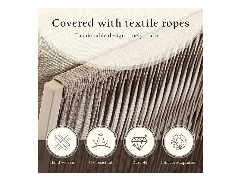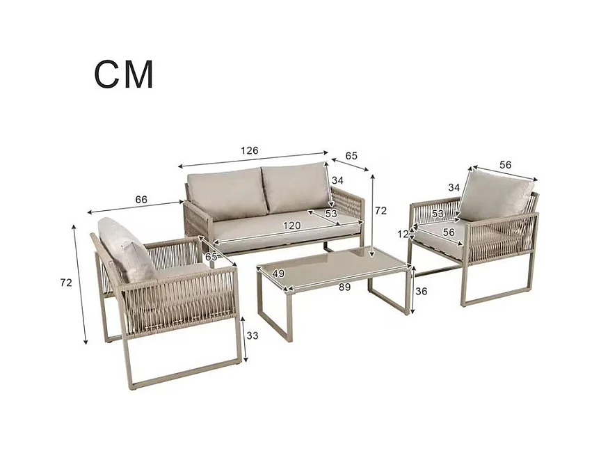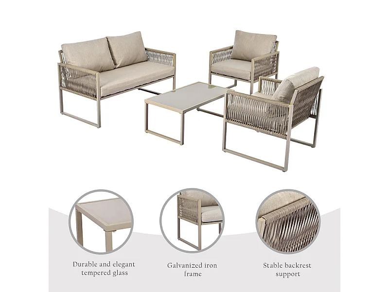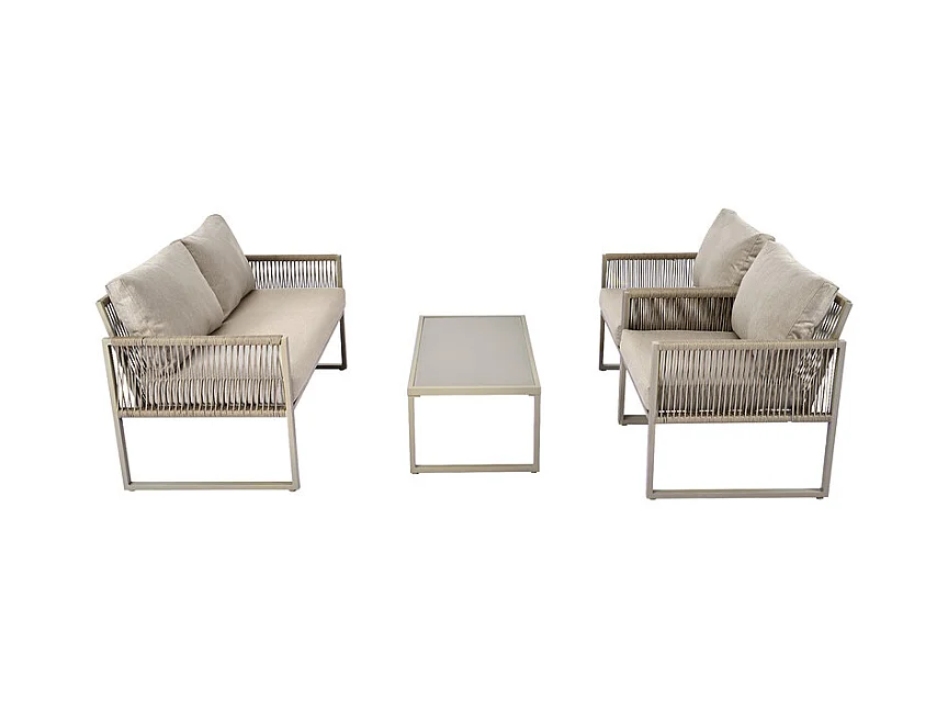 Salon de jardin en Fer galvanisé - 1 canapé 2 fauteuils et 1 table basse en verre - décoré de Corde - Taupe