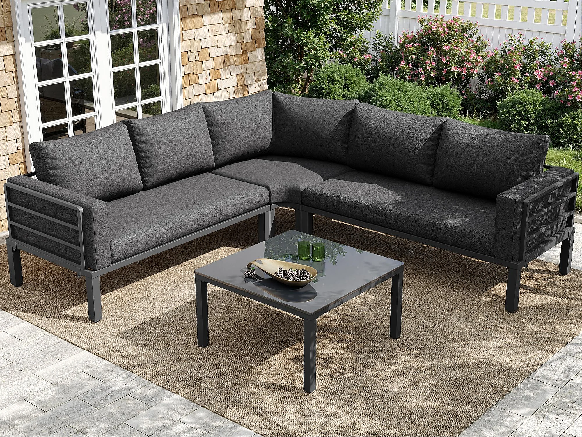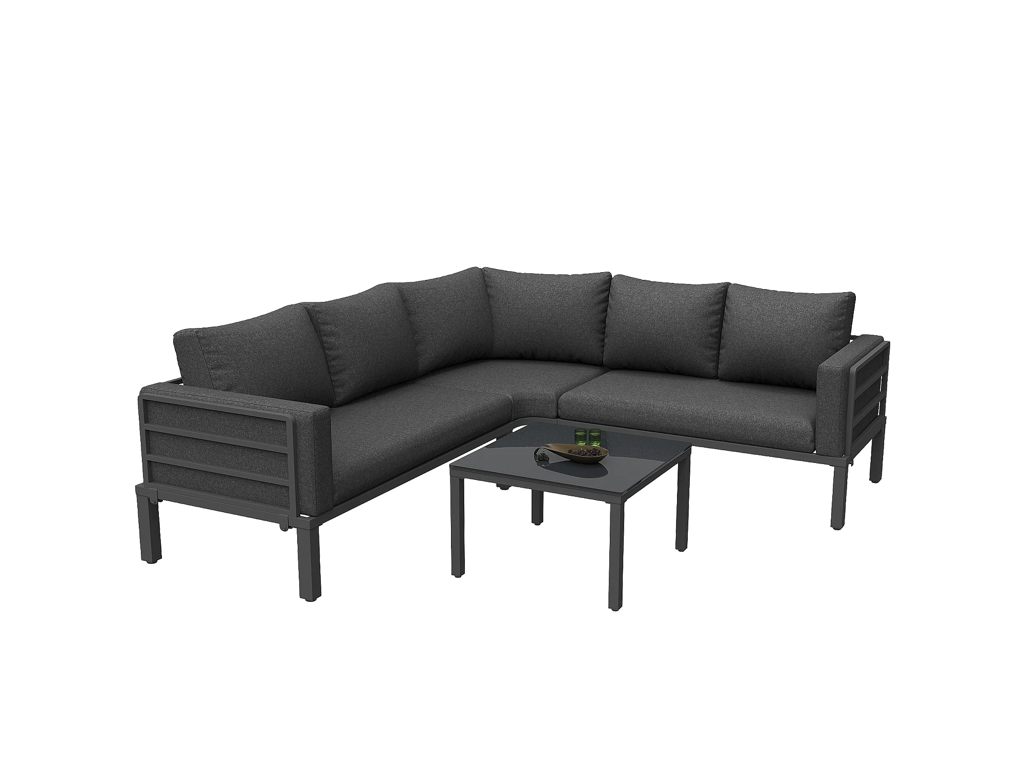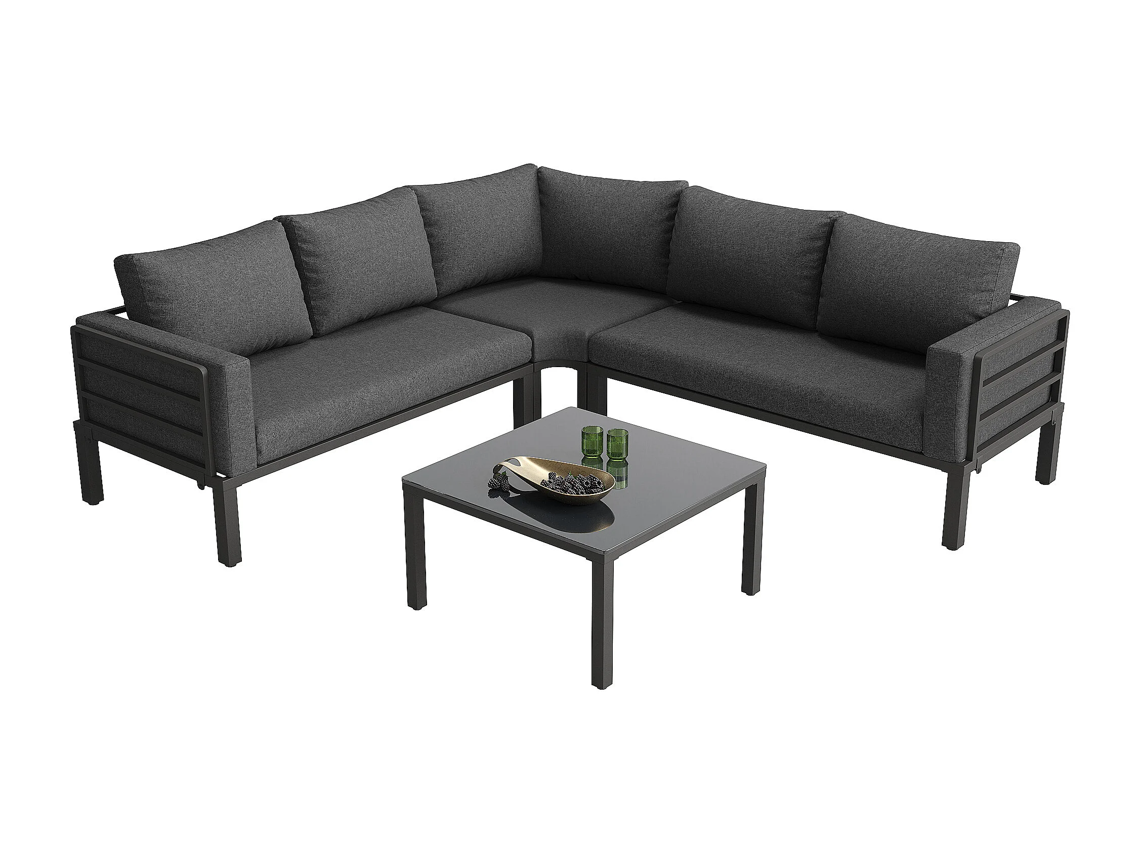 Salon de jardin en fer galvanisé 4 places - 2 canapés, 1 tables basse en verre trempé - avec coussins - Gris