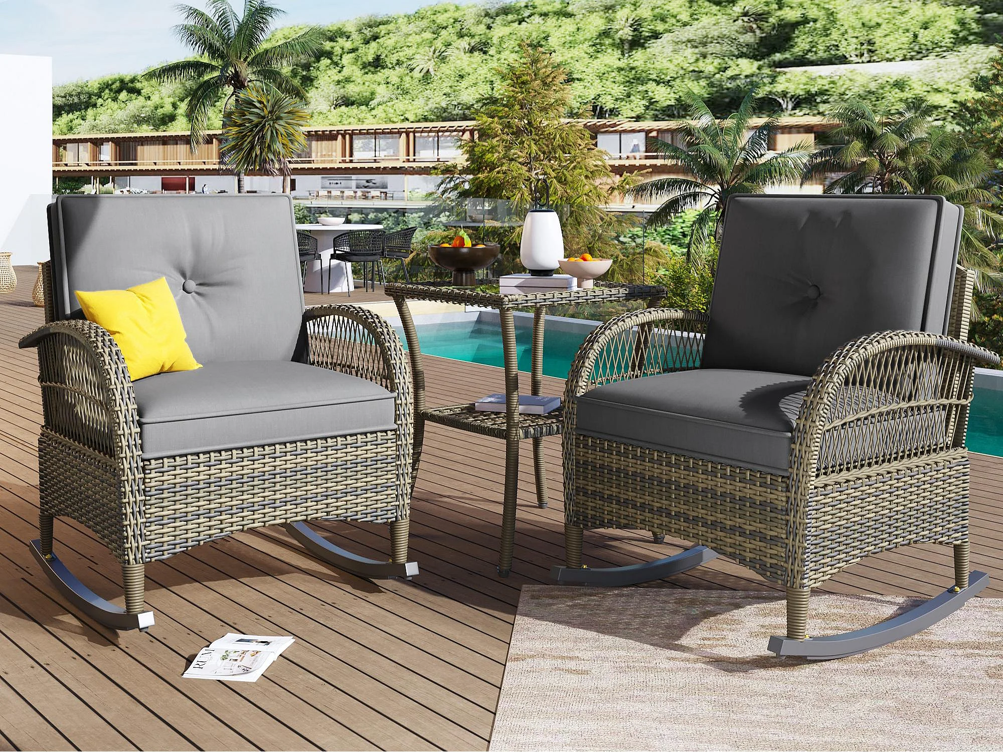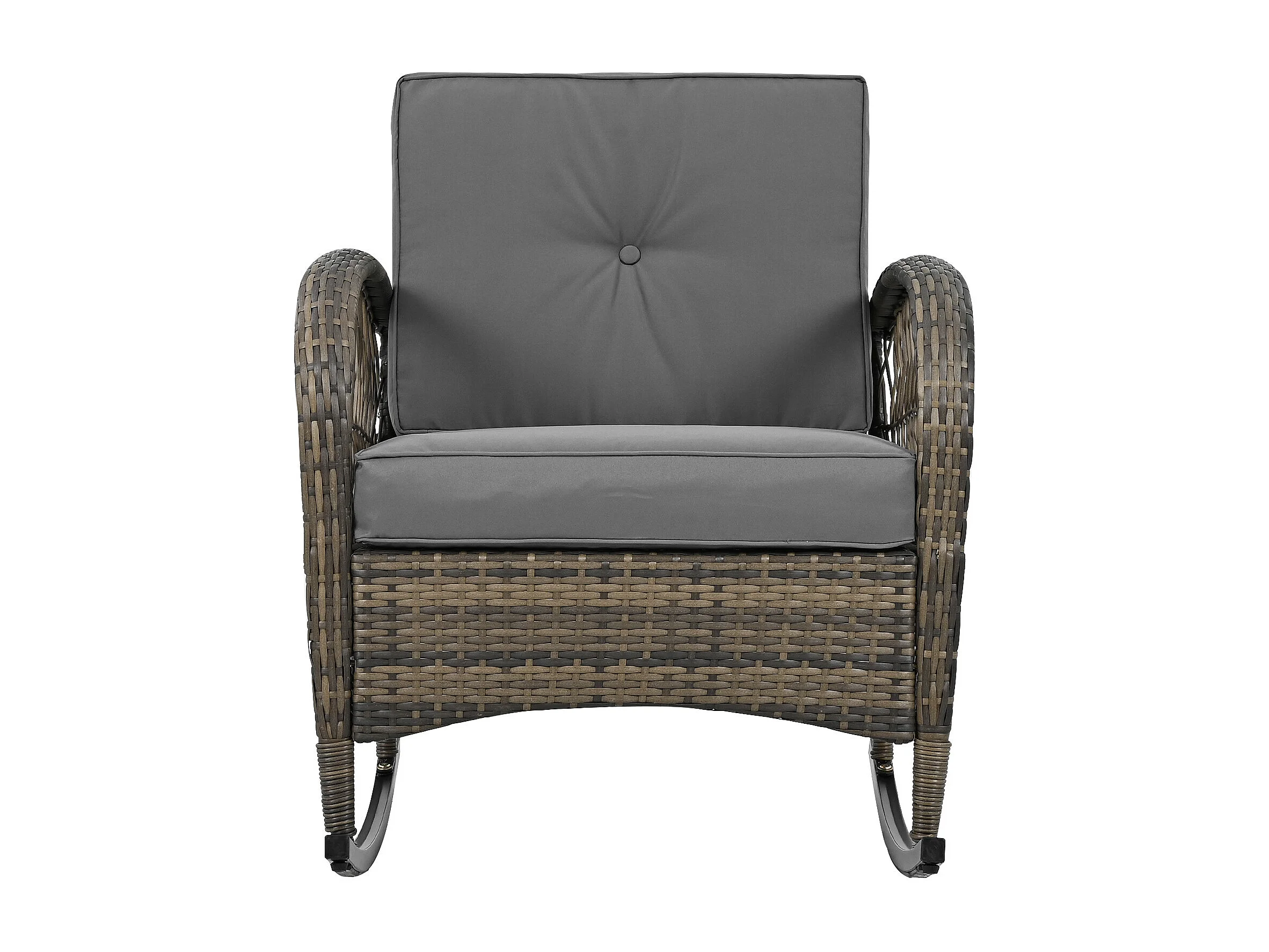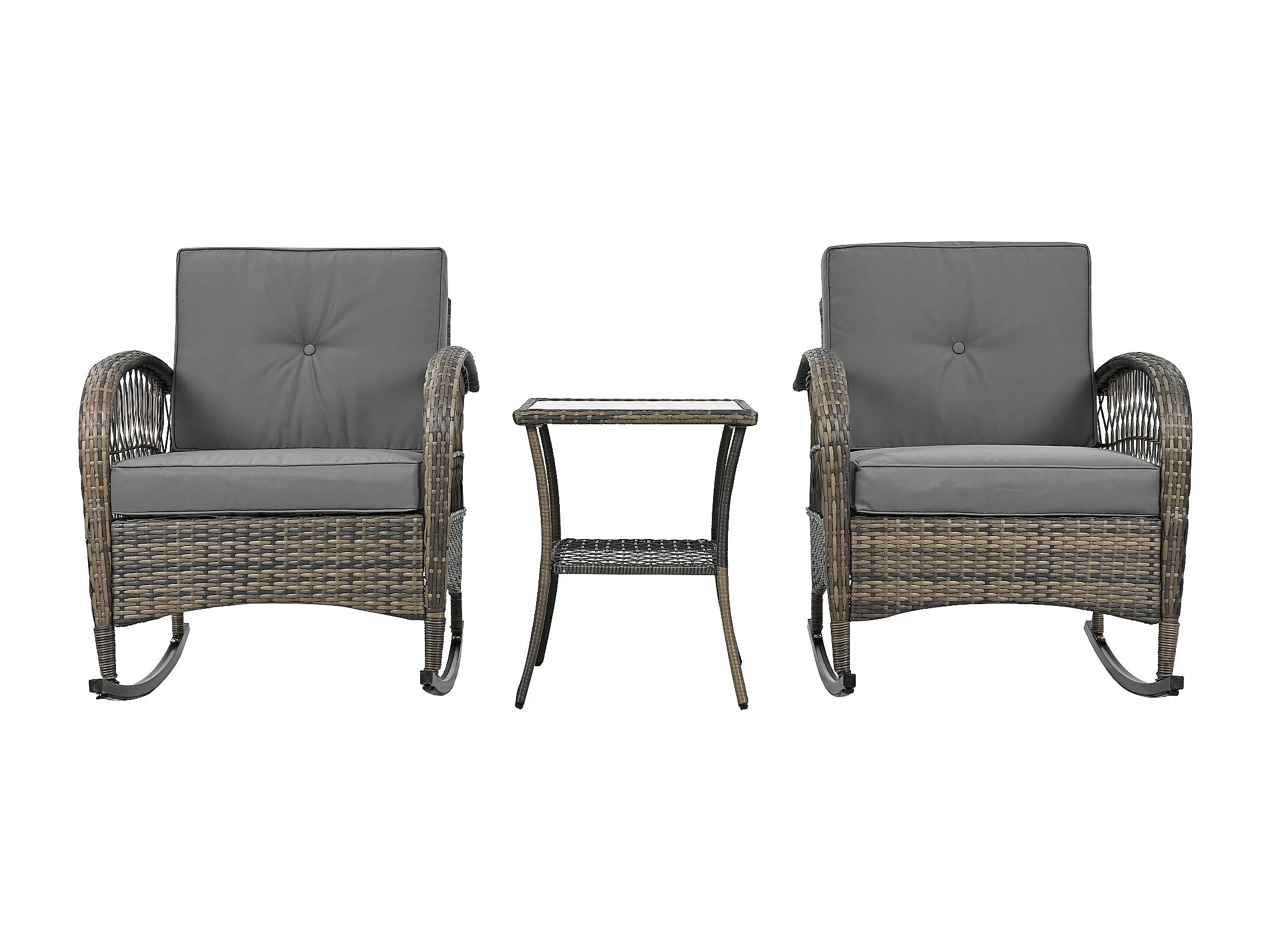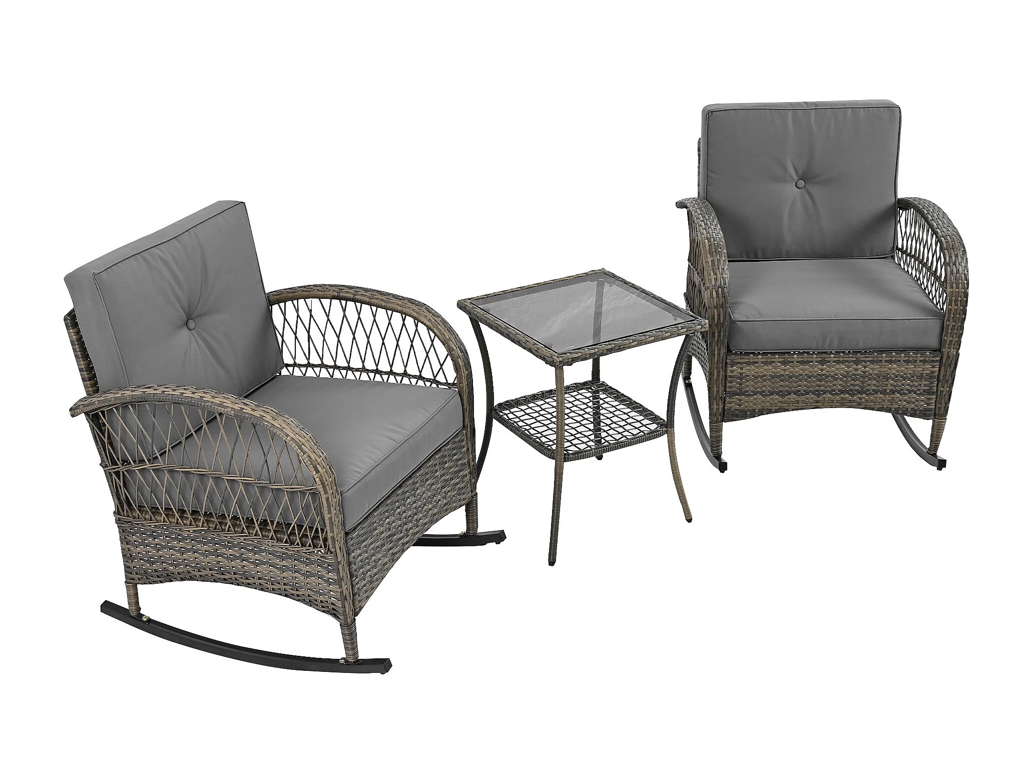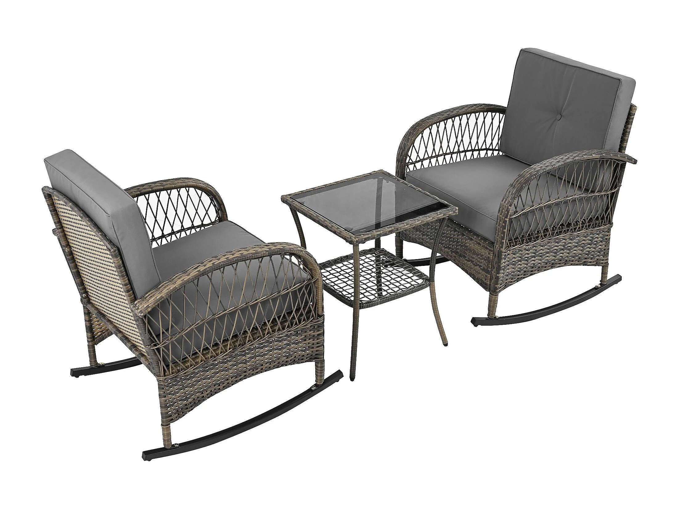 Salon de jardin en rotin - 2 chaises à bascule - 1 Table de bar - pour 2 personnes - plateau en acacia avec coussins gris
