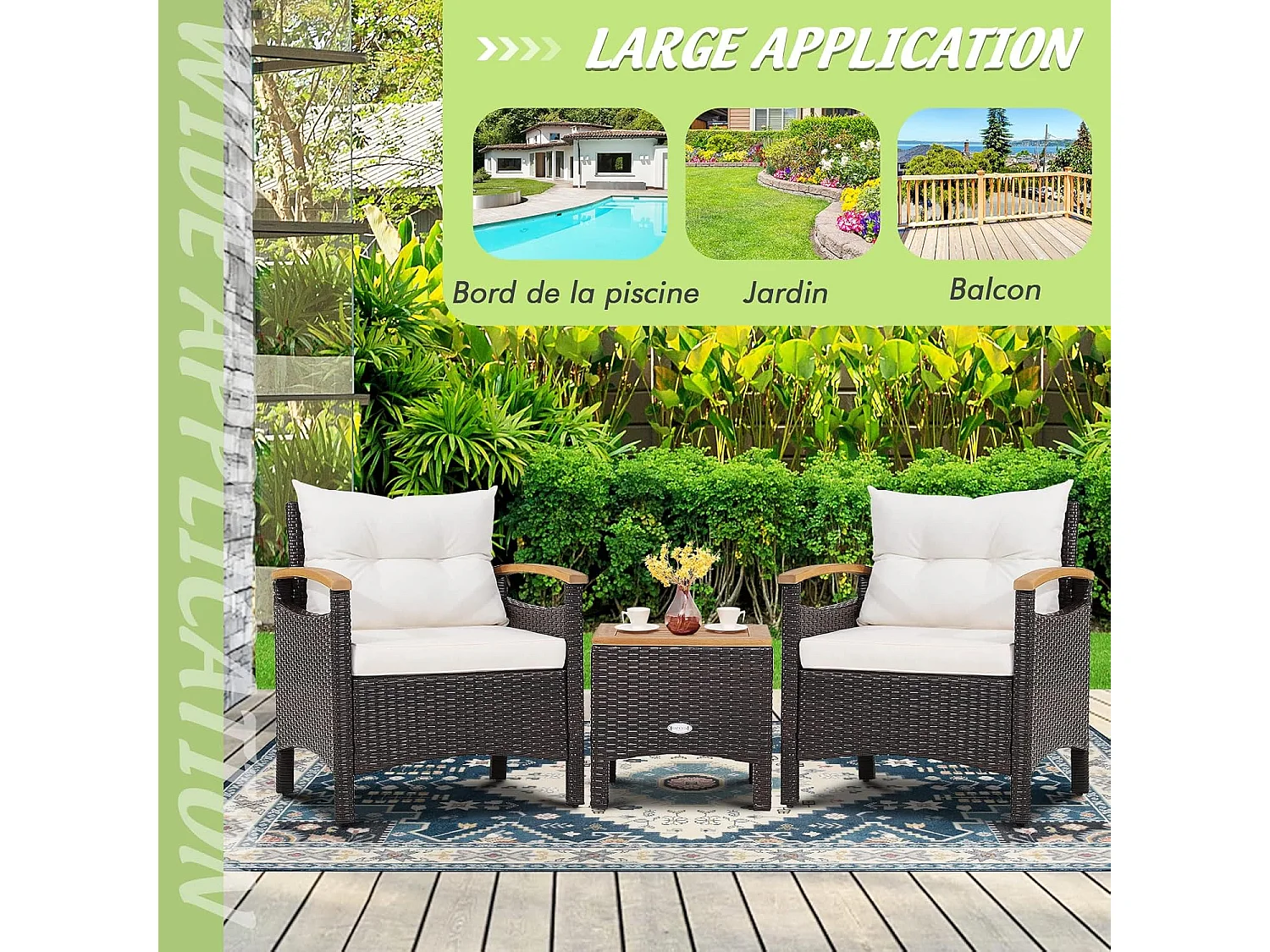 Salon de Jardin en Rotin et fibre naturelle - 3 Pièces - Table Basse et 2 Fauteuils avec Coussin Amovible - Accoudoirs en Bois d’Acacia