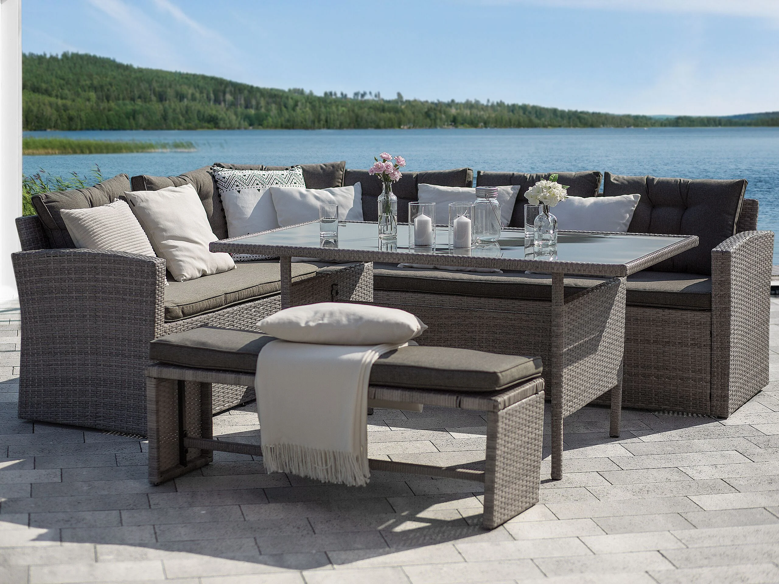 Ensemble de salon de jardin avec table 8 places VITERBO avec coussins Polyrotin Gris