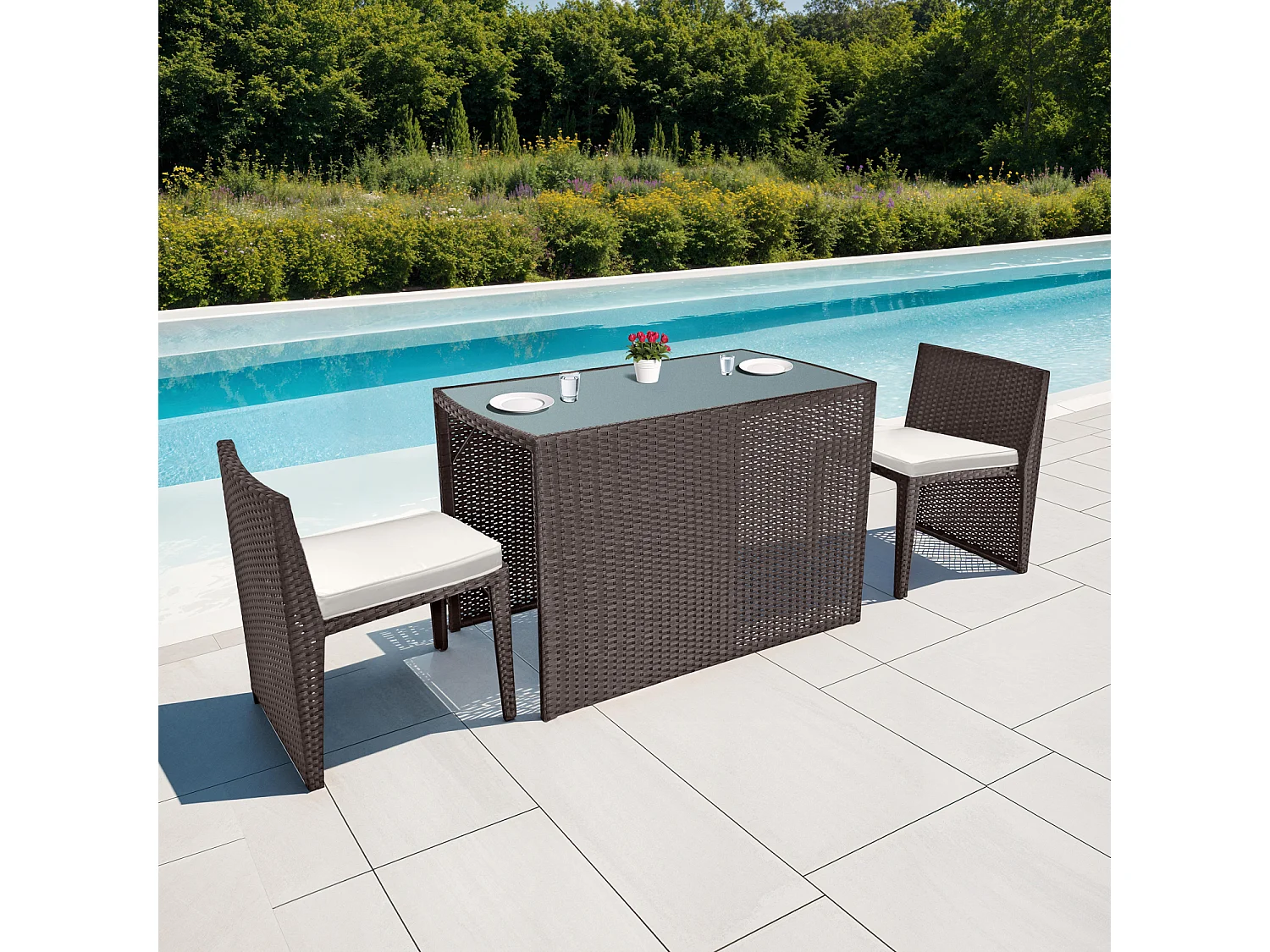 Salon de jardin encastrable SANTORIN en résine tressée marron 2 places - coussins ivoire - HAPPY GARDEN