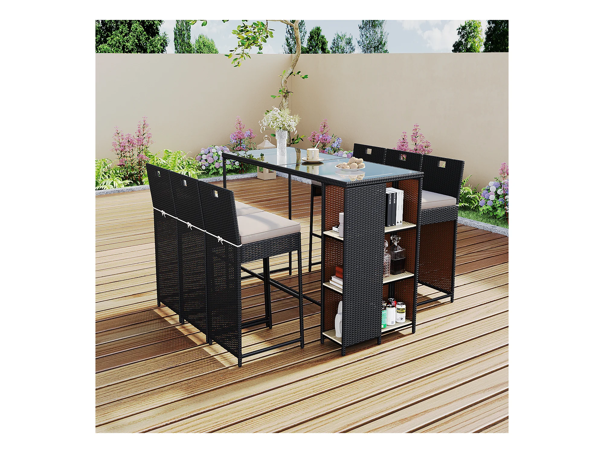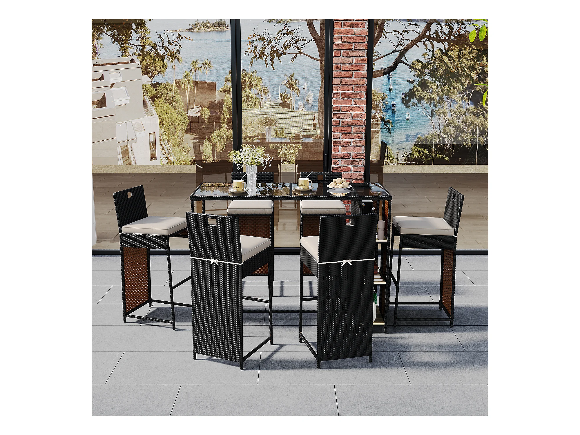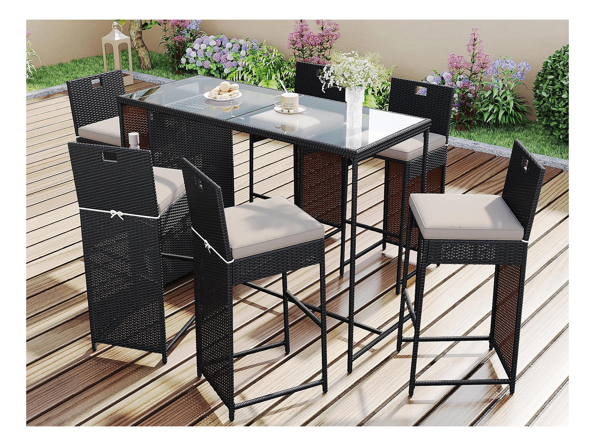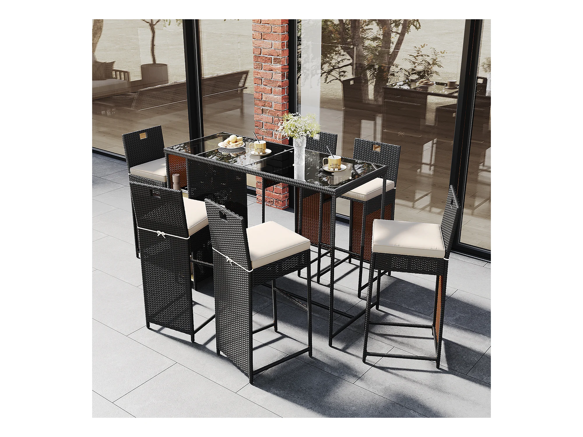 Salon de jardin, ensemble de bar de jardin 7 pièces avec coussins, 6 tabourets et d'une table haute, plateau de table en verre trempé, noir-marron