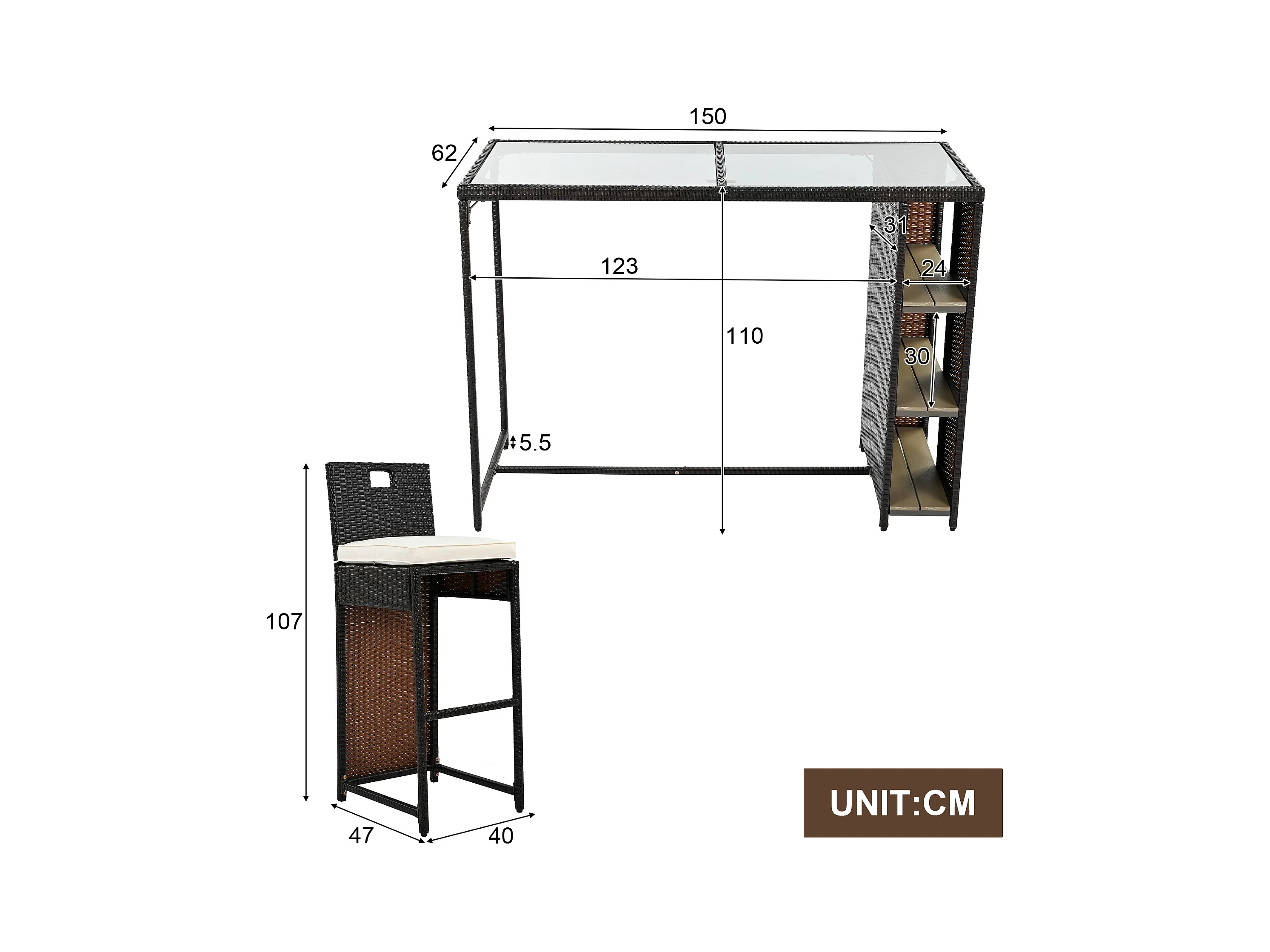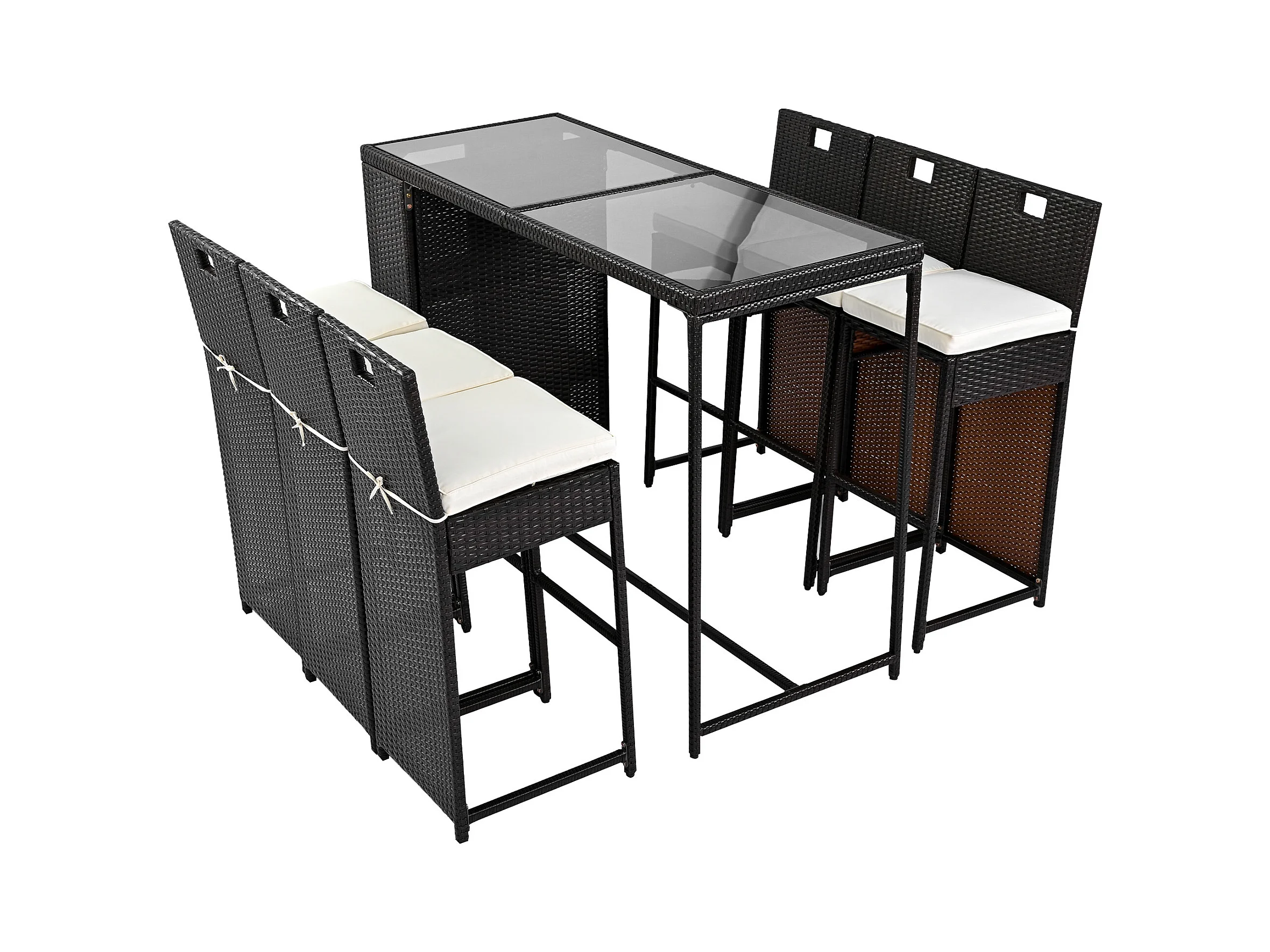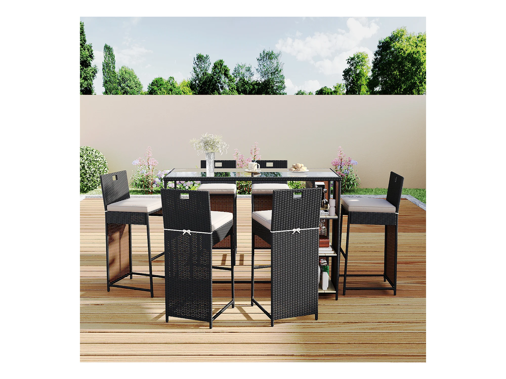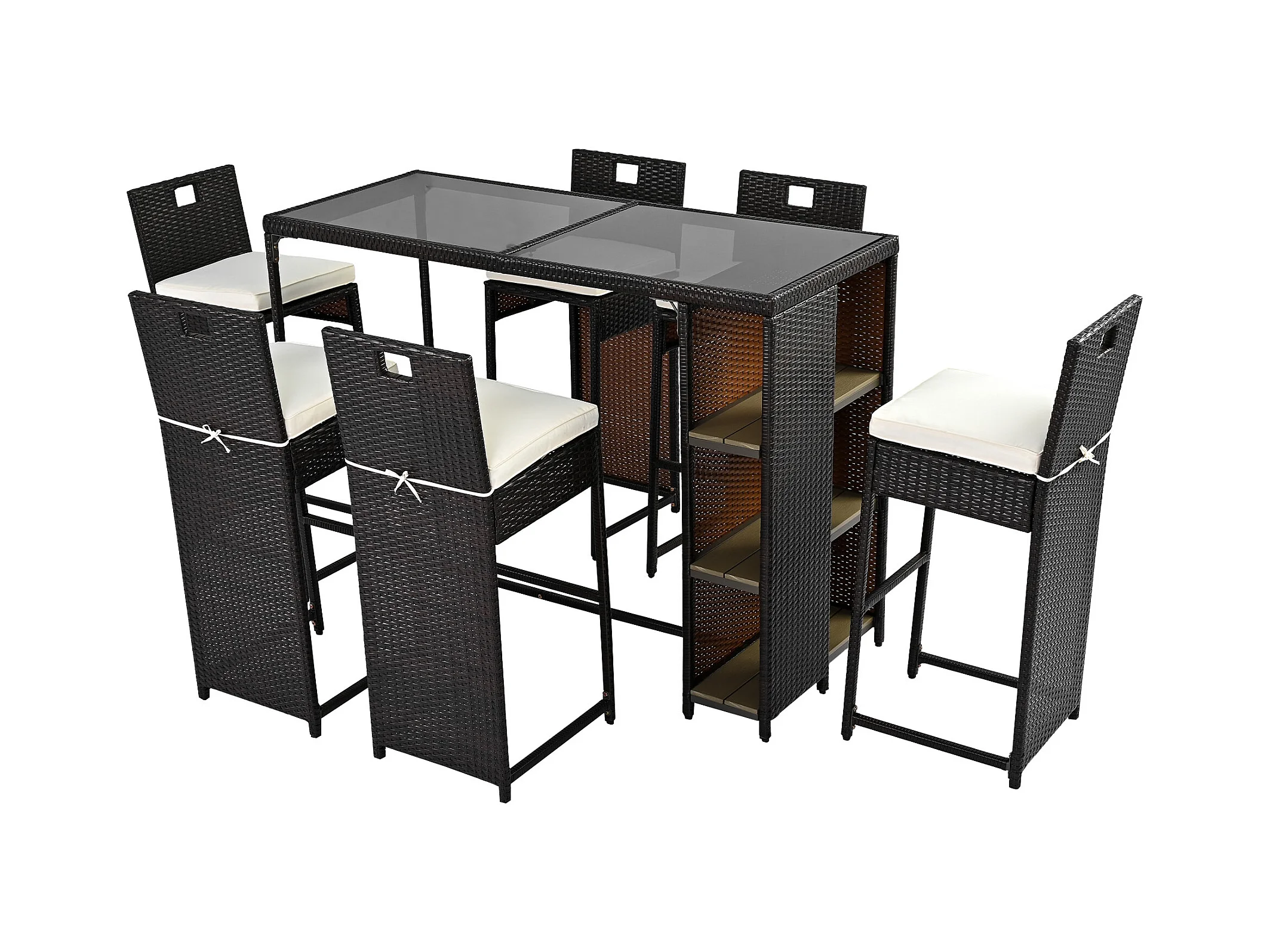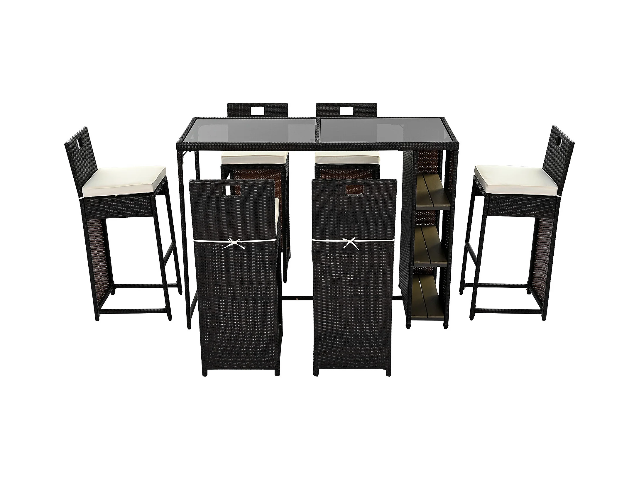 Salon de jardin, ensemble de bar de jardin 7 pièces avec coussins, 6 tabourets et d'une table haute, plateau de table en verre trempé, noir-marron