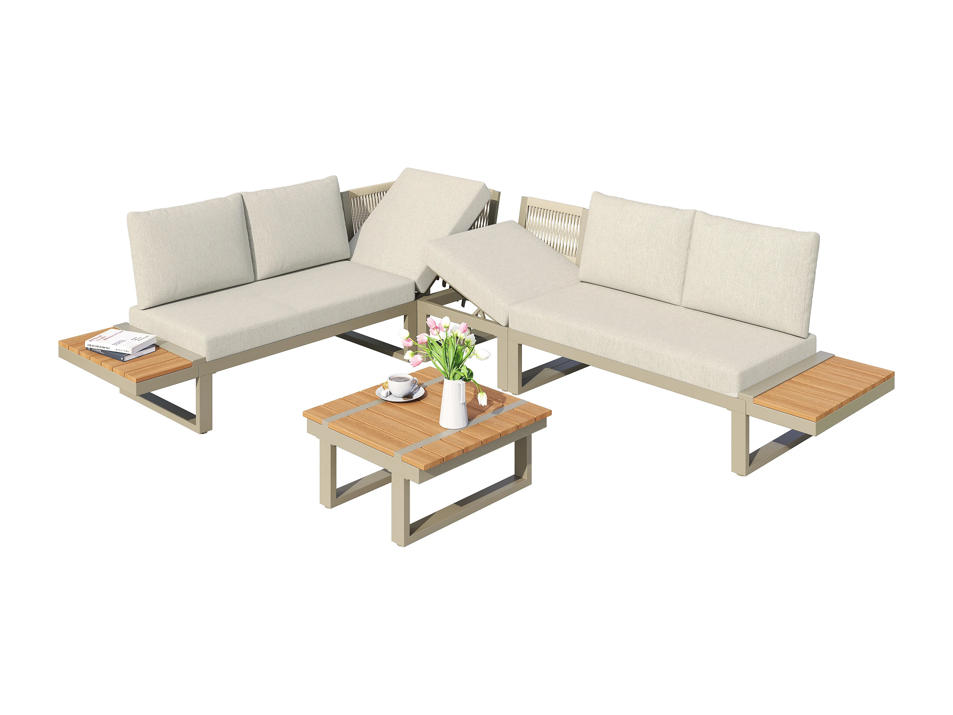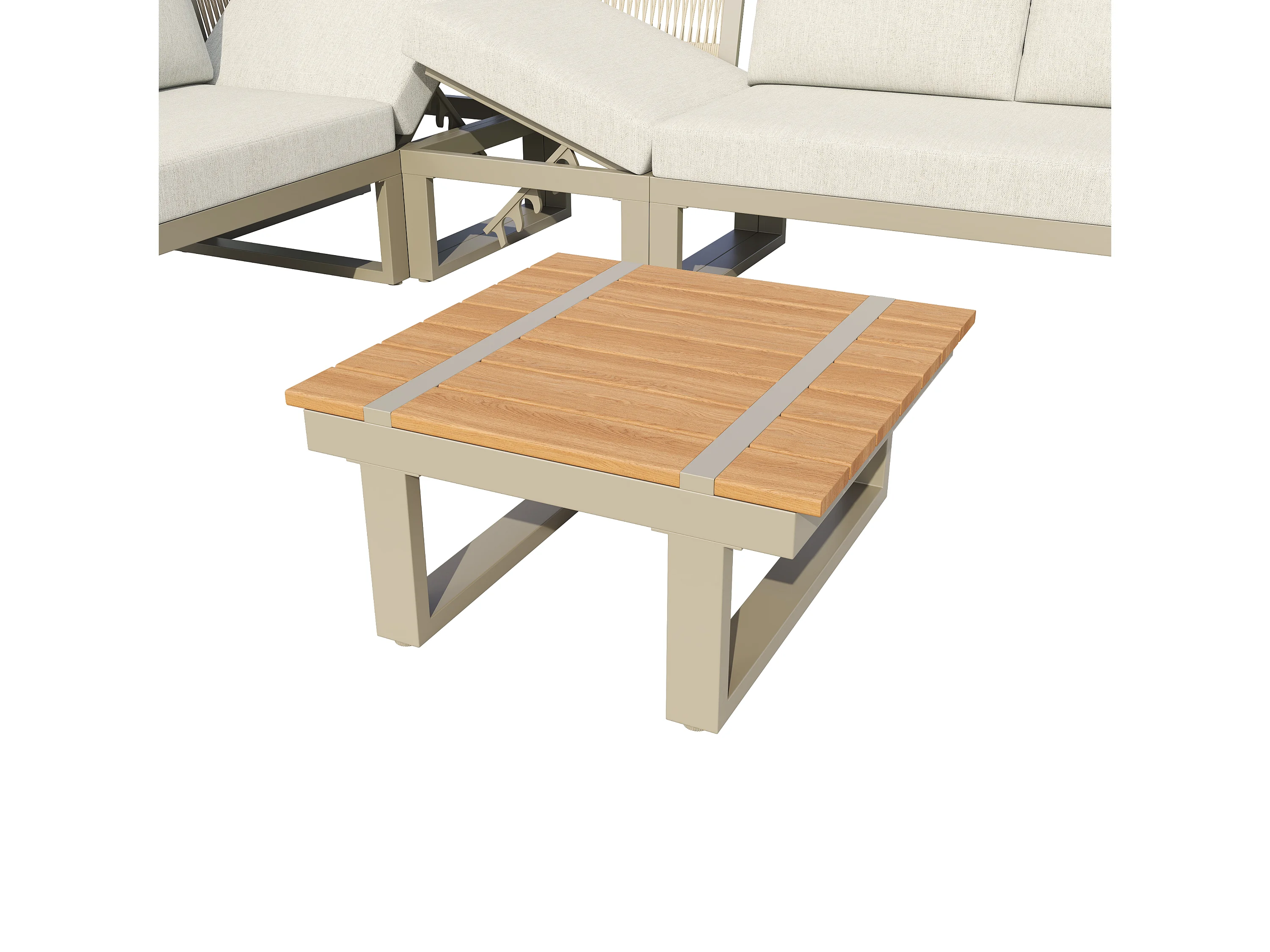 Salon de jardin - ensemble de meubles - 6 places - en acier galvanisé - canapé d'angle - avec table basse - plateau en bois plastique - Beige