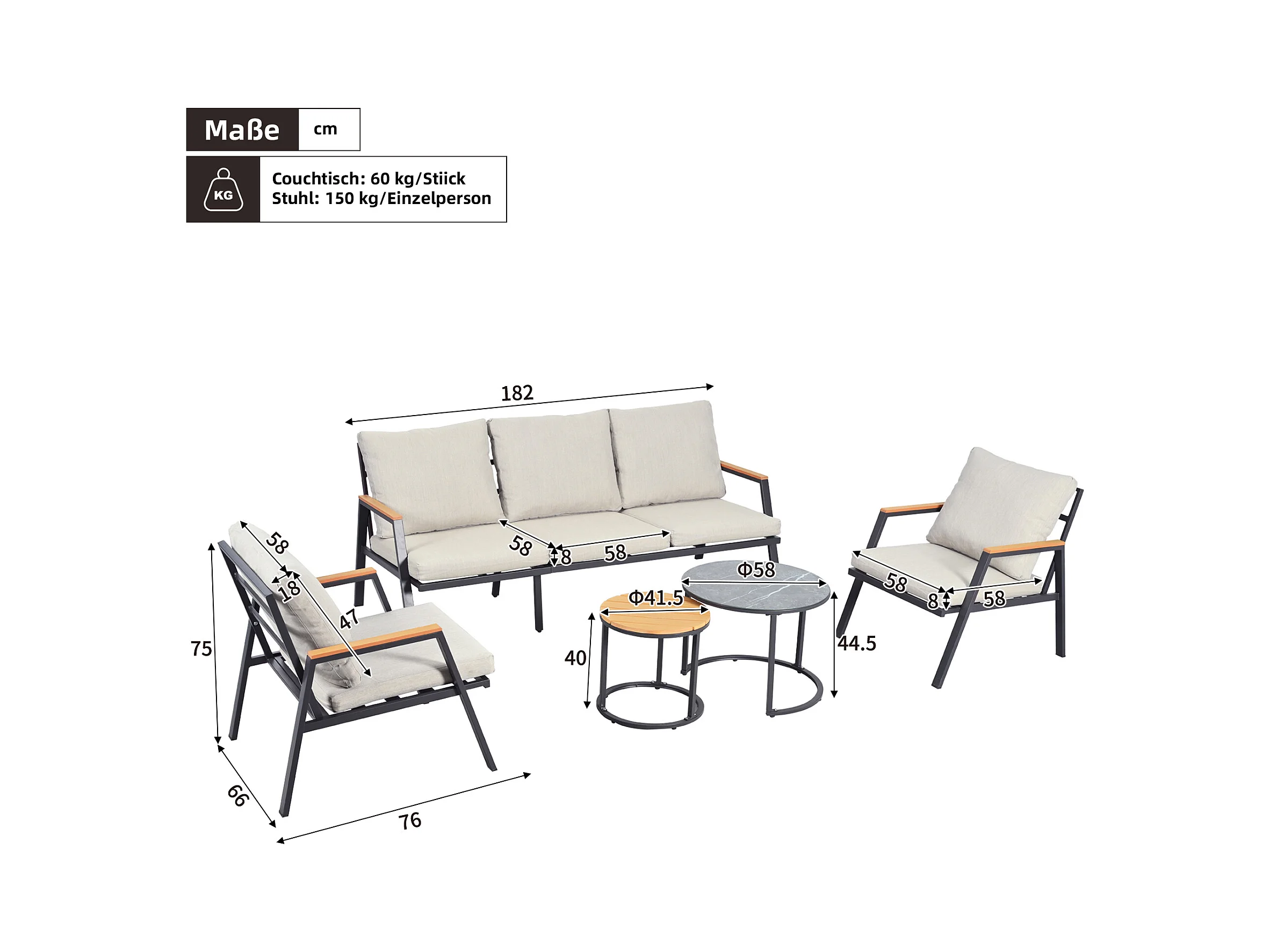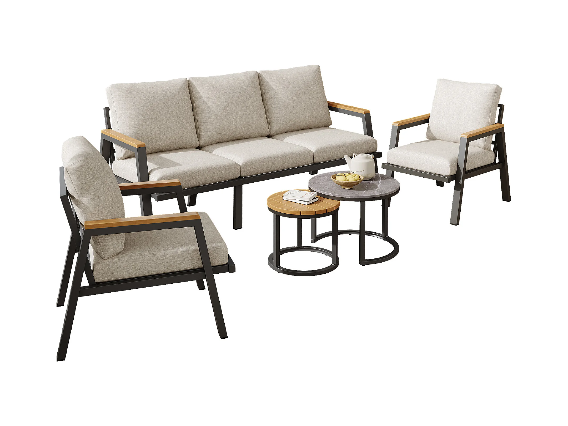 Salon de jardin, ensemble de meubles de jardin, 5 places, canapé 3 places, 2 fauteuils et 2 tables basses, extérieur, acier galvanisé, gris
