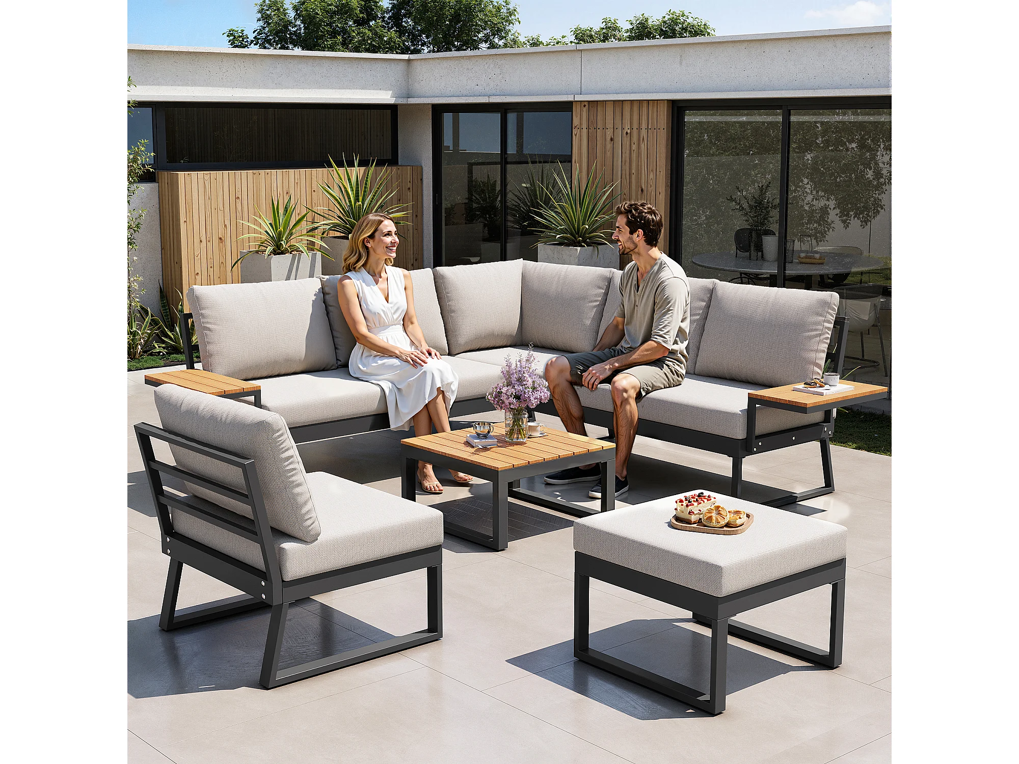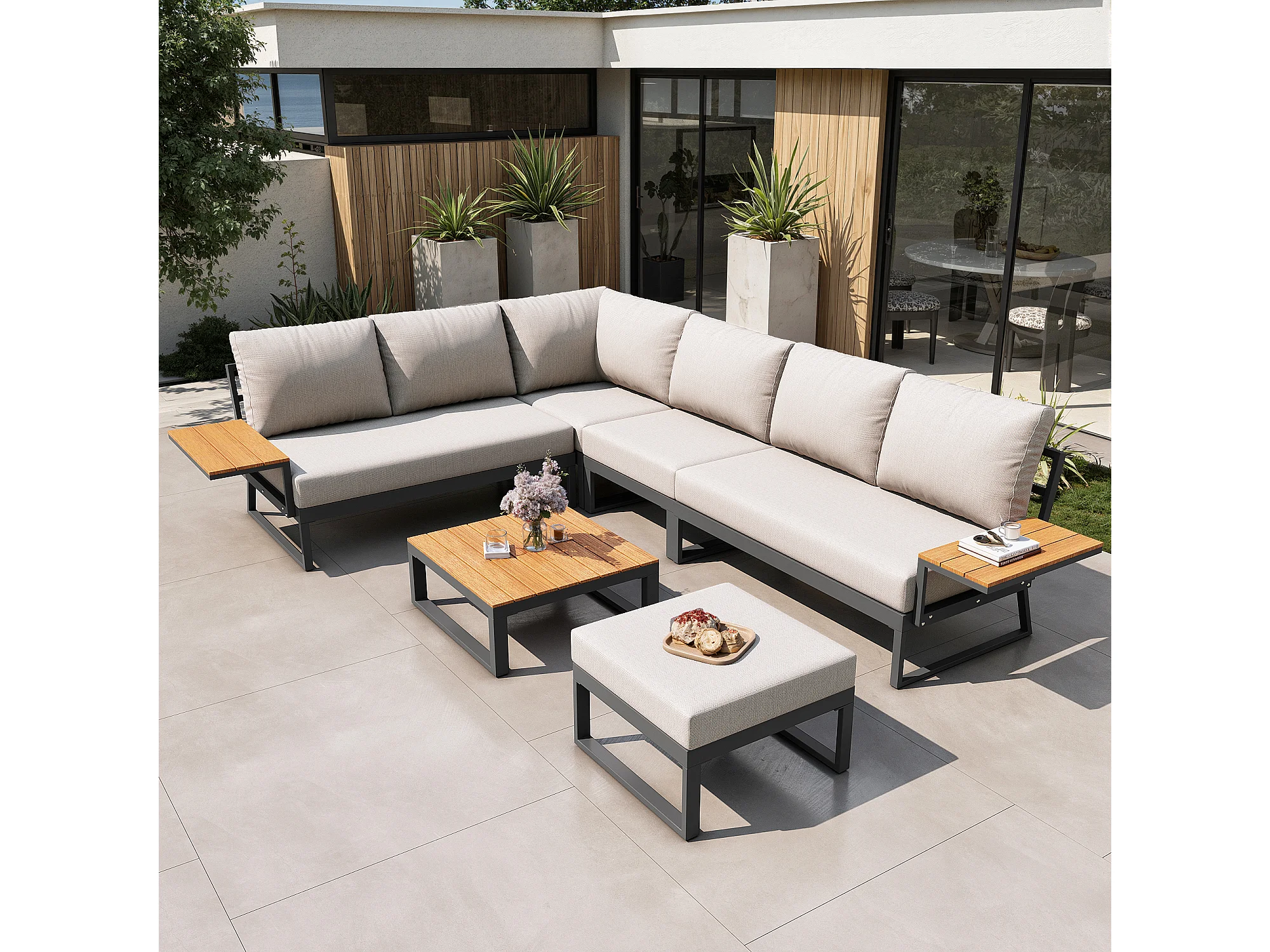 Salon de jardin, ensemble de meubles en bois-plastique pour 6-7 personnes - canapé d'angle - en fer galvanisé - tables - 1 Chaise - banc, Beige
