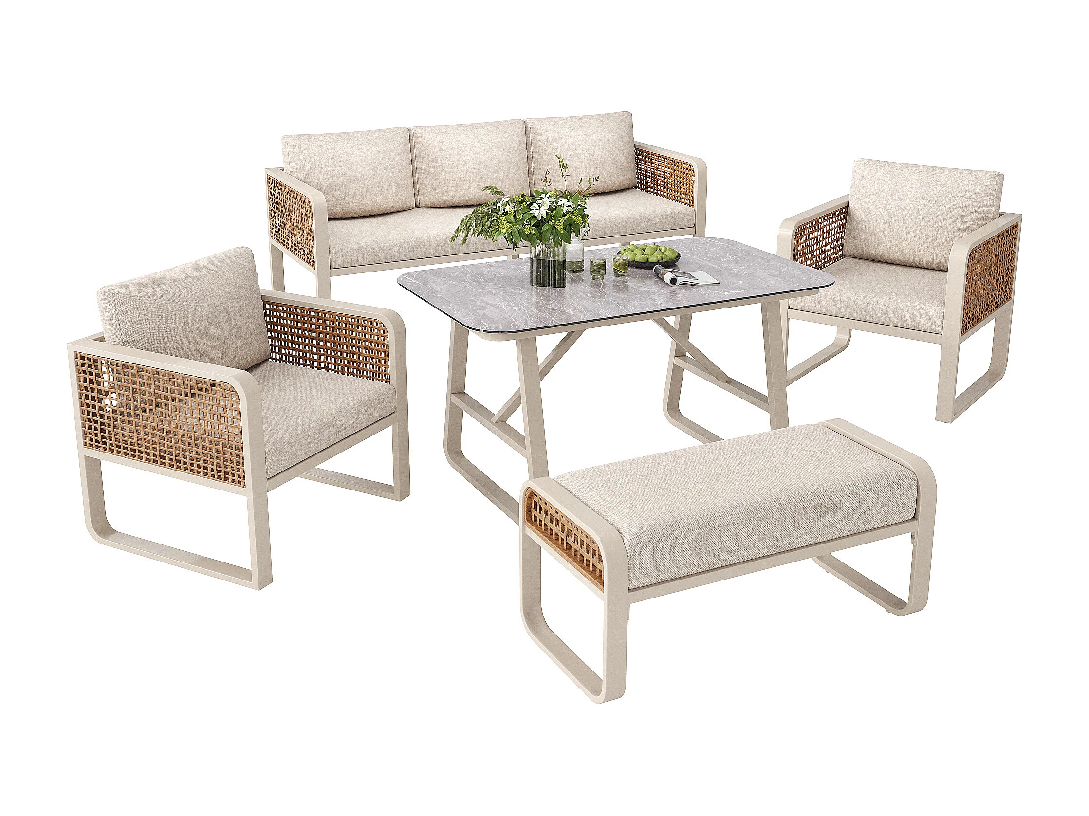 Salon de jardin, ensemble de meubles en rotin PE pour 6-7 palces - Canapé 3 places - en fer galvanisé - 2 fauteuils - table à l'aspect marbré, Beige