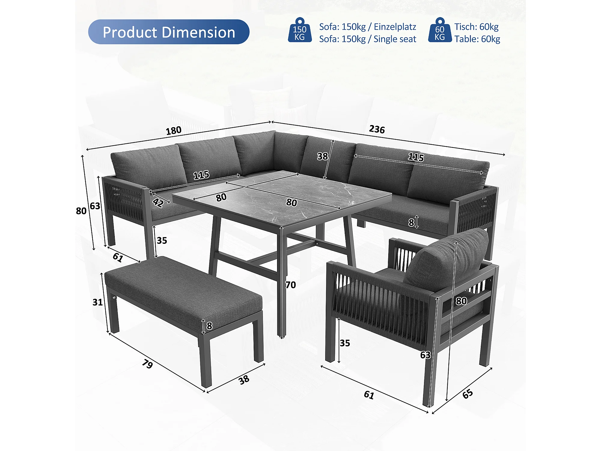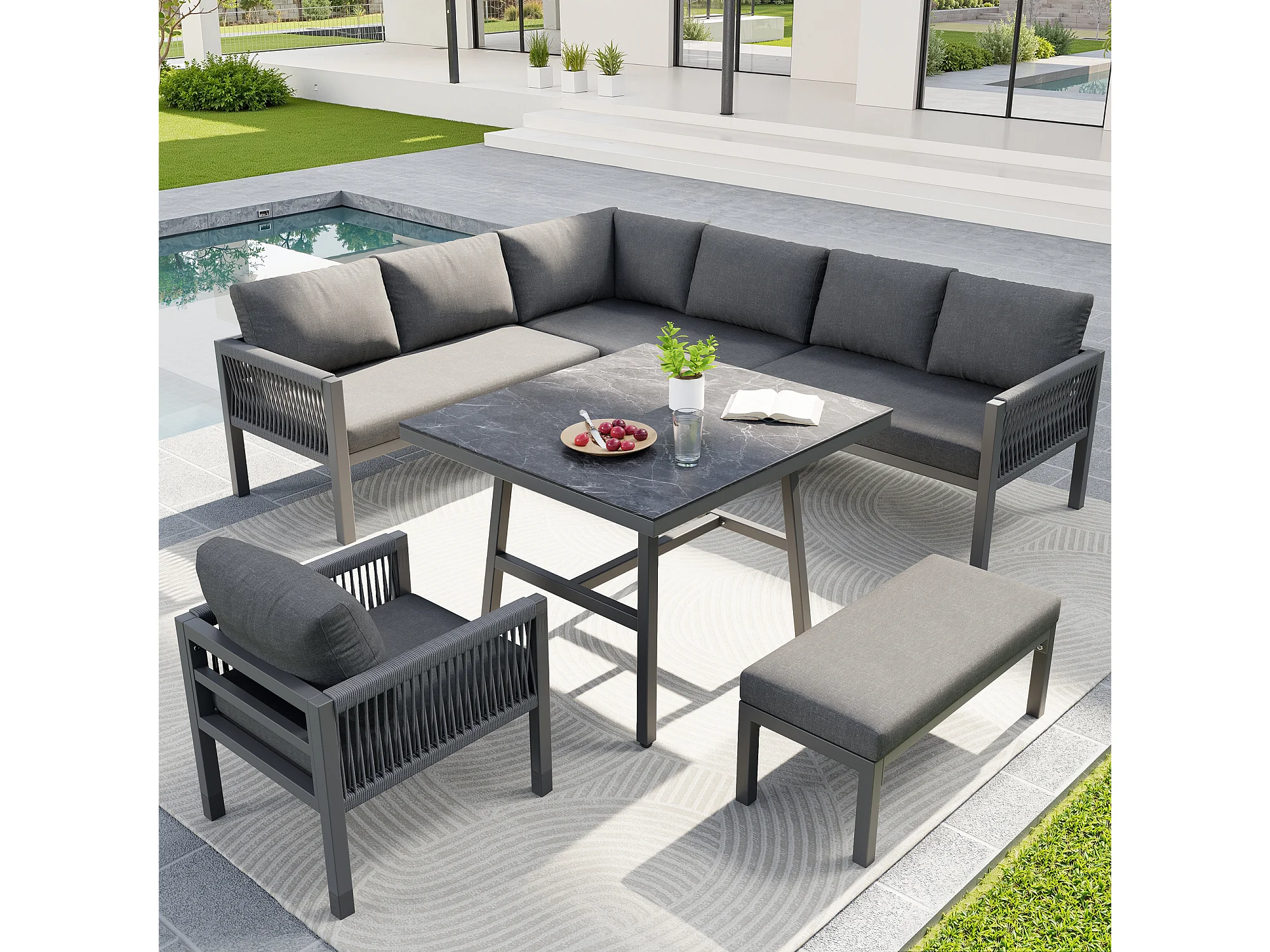 Salon de jardin, ensemble de meubles en rotin PE pour 6-7 personnes - cordage - canapé d'angle - en fer galvanisé - tables - fauteuils - banc, gris