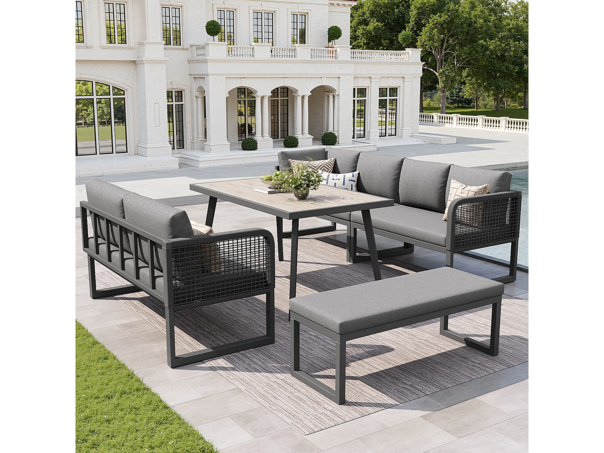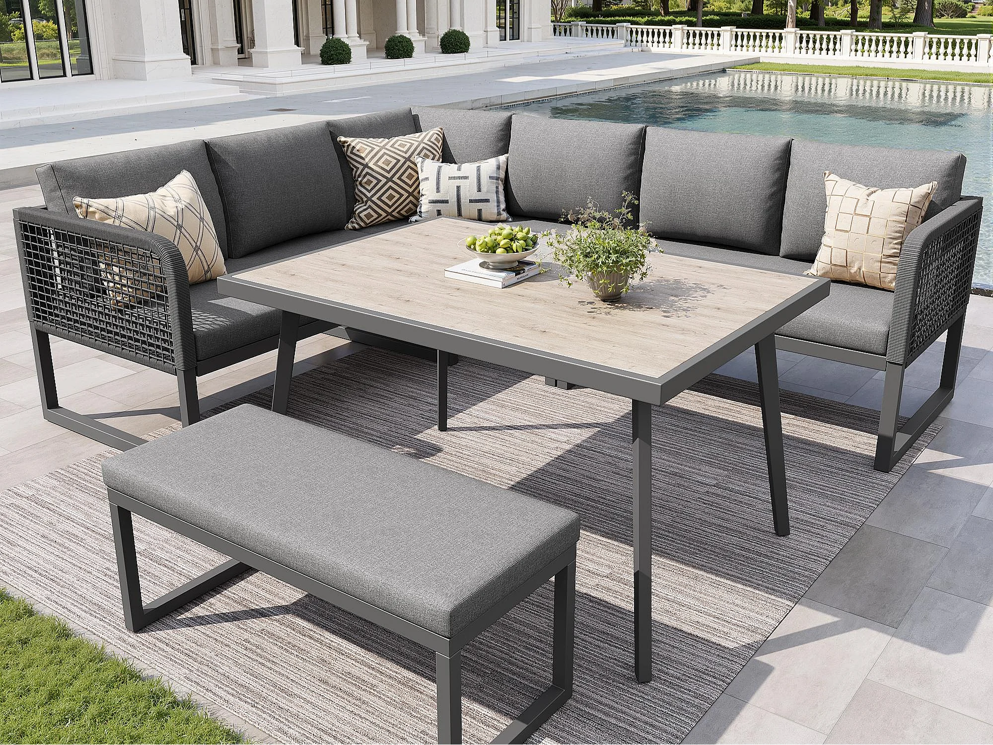 Salon de jardin, ensemble de meubles en rotin PE pour 6-8 places - canapé d'angle - en fer galvanisé - Plateau de table à l'aspect bois- banc, Gris