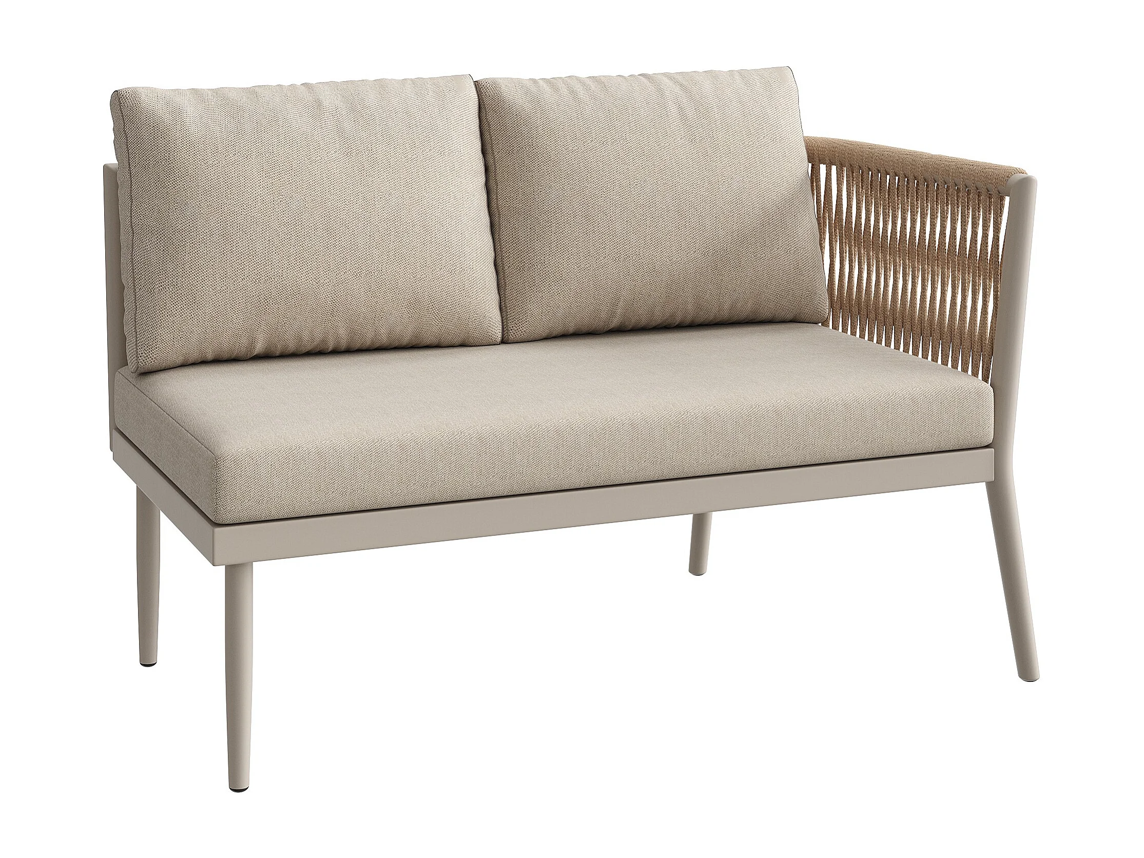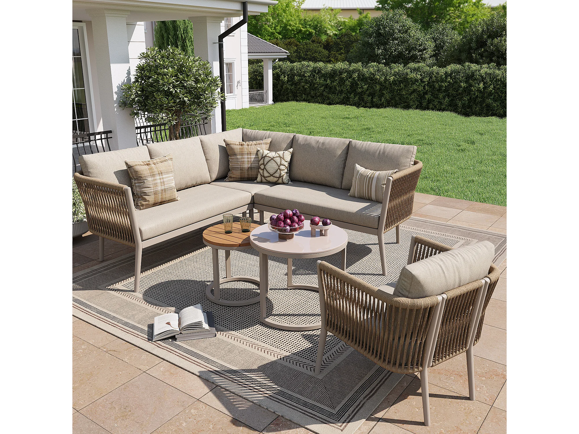 Salon de jardin, ensemble de meubles pour 5-6 places, en rotin PE, cordage, en fer galvanisé, canapé d'angle, 2 table basse, Beige