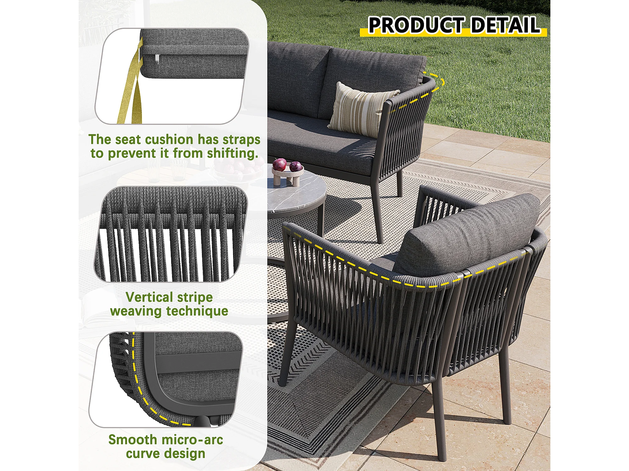 Salon de jardin, ensemble de meubles pour 5-6 places, en rotin PE, cordage, en fer galvanisé, canapé d'angle, 2 table basse, Gris