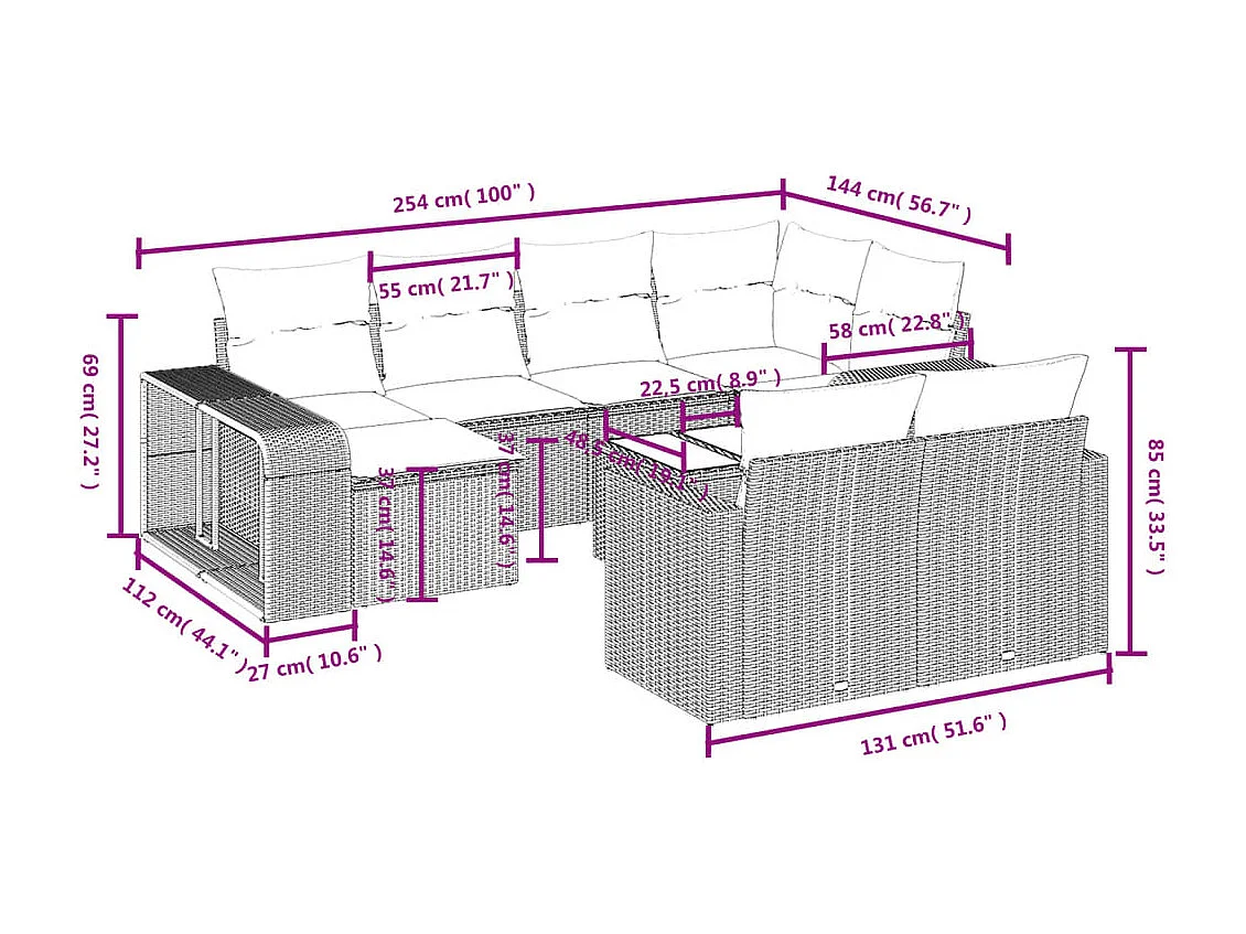 Salon de jardin 8 pcs avec coussins marron résine tressée