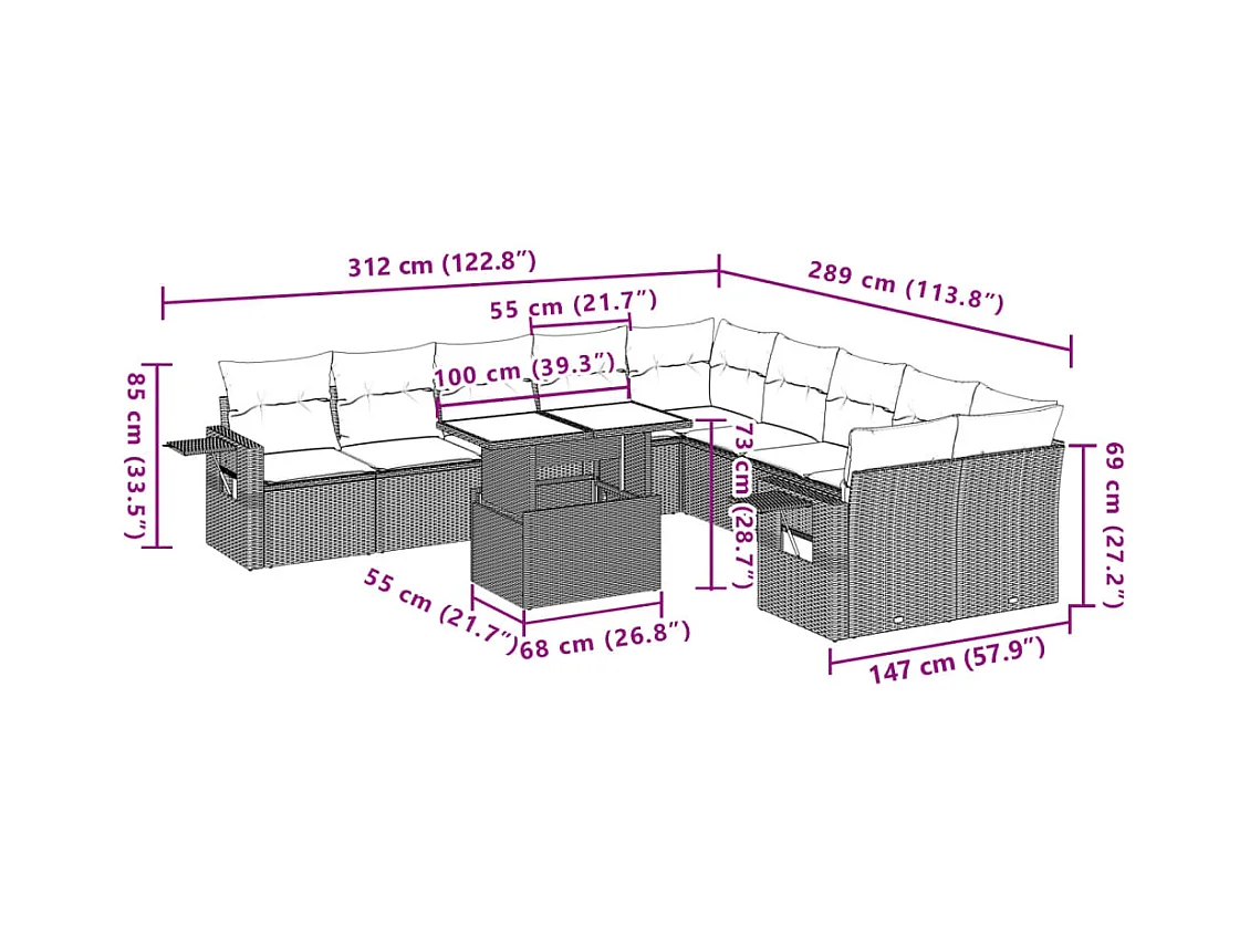 Salon de jardin et coussins 11 pcs marron résine tressée