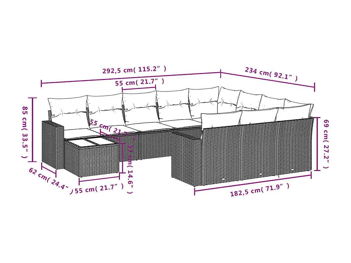 Salon de jardin et coussins 11 pcs marron résine tressée