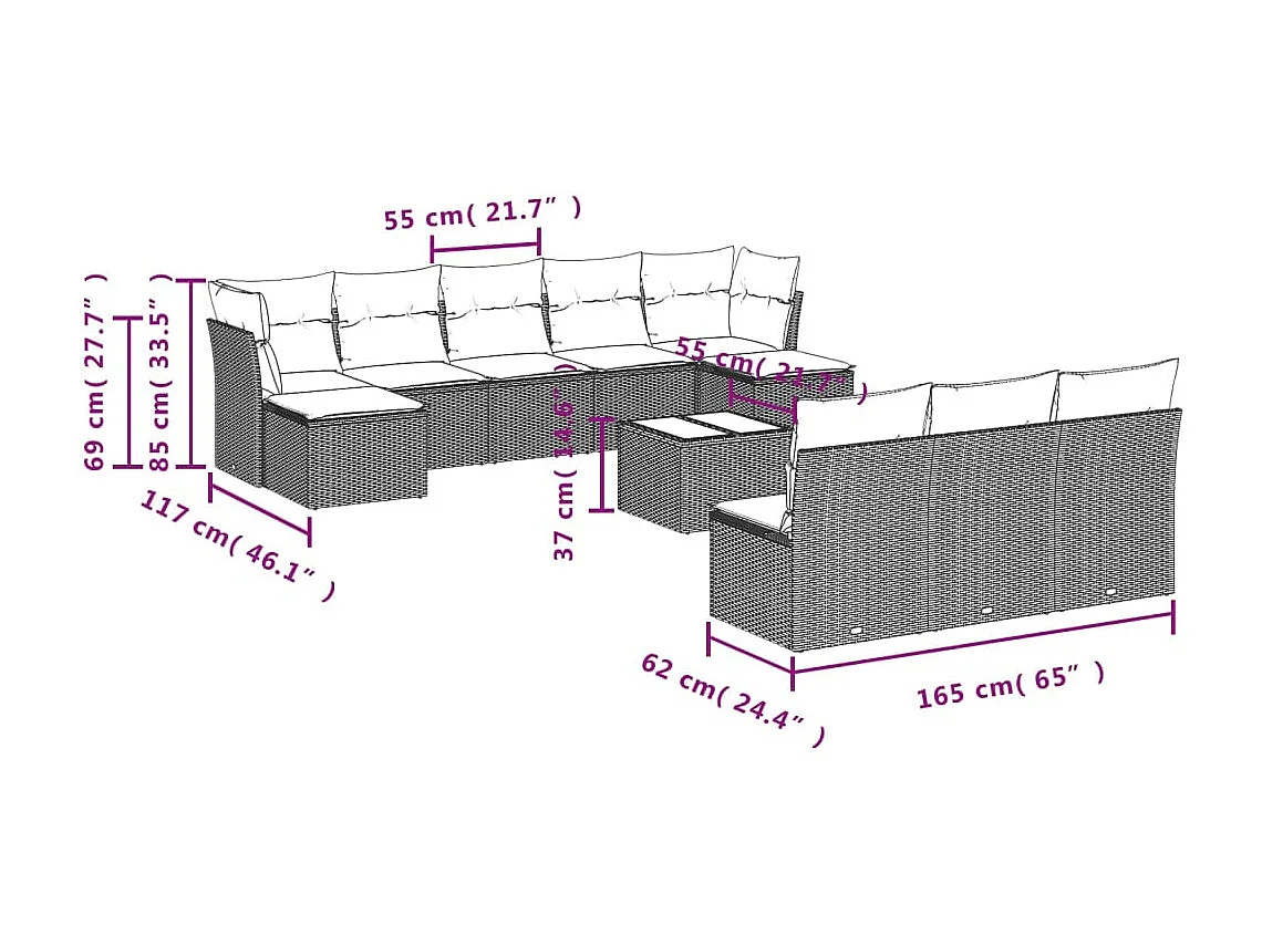 Salon de jardin et coussins 11 pcs marron résine tressée