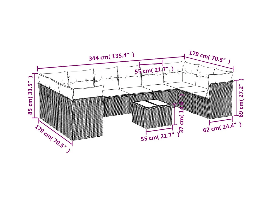 Salon de jardin et coussins 11 pièces marron résine tressée
