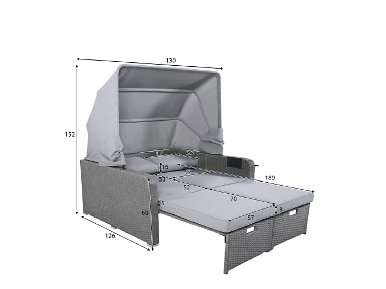 Salon de jardin extensible - Canapé lounge en rotin PE avec auvent réglable - structure en acier - Gris
