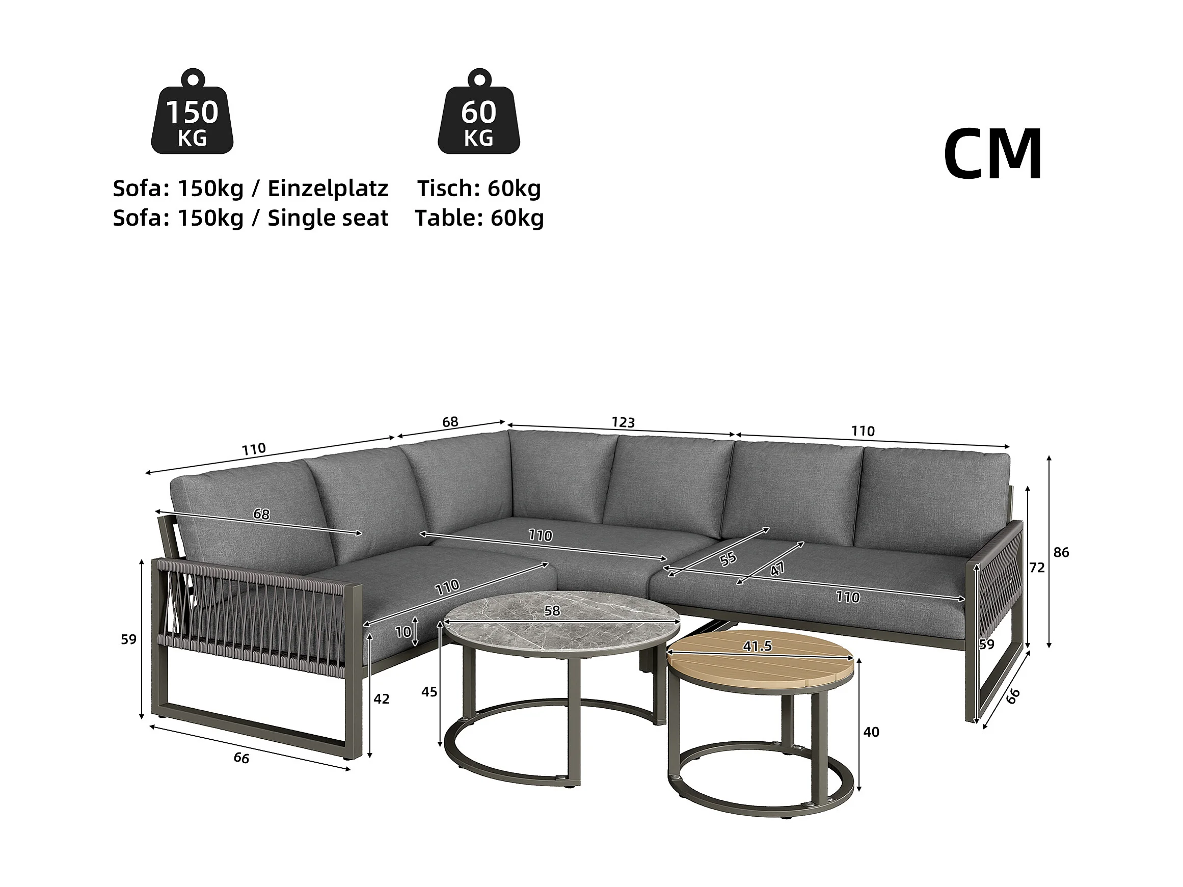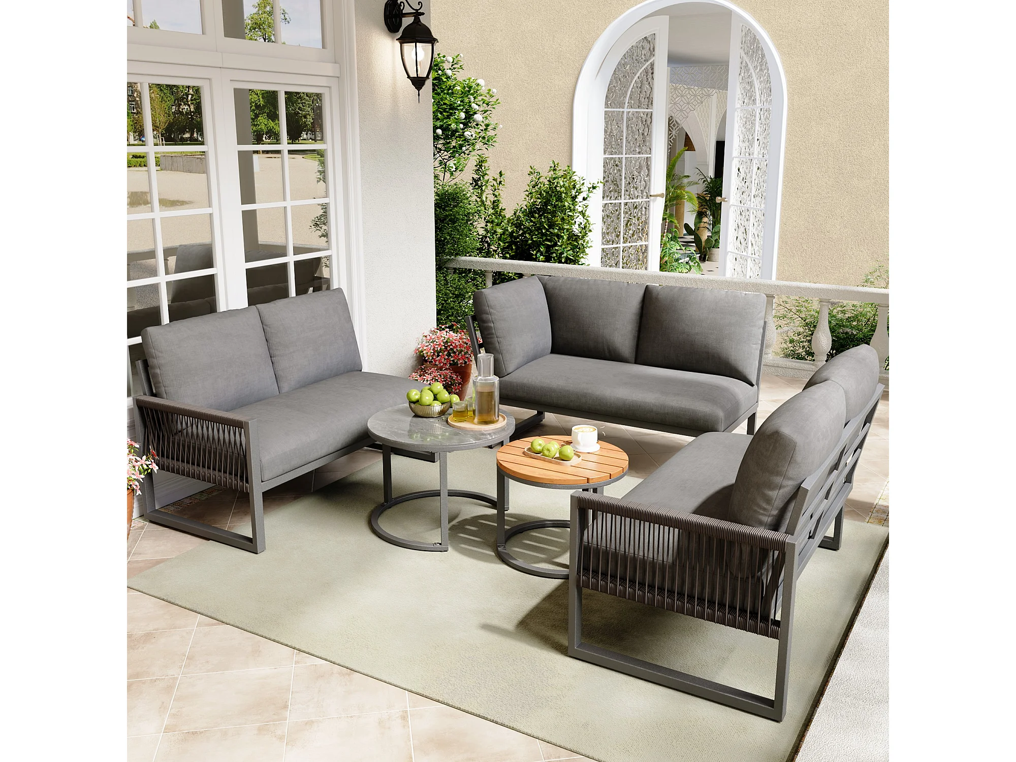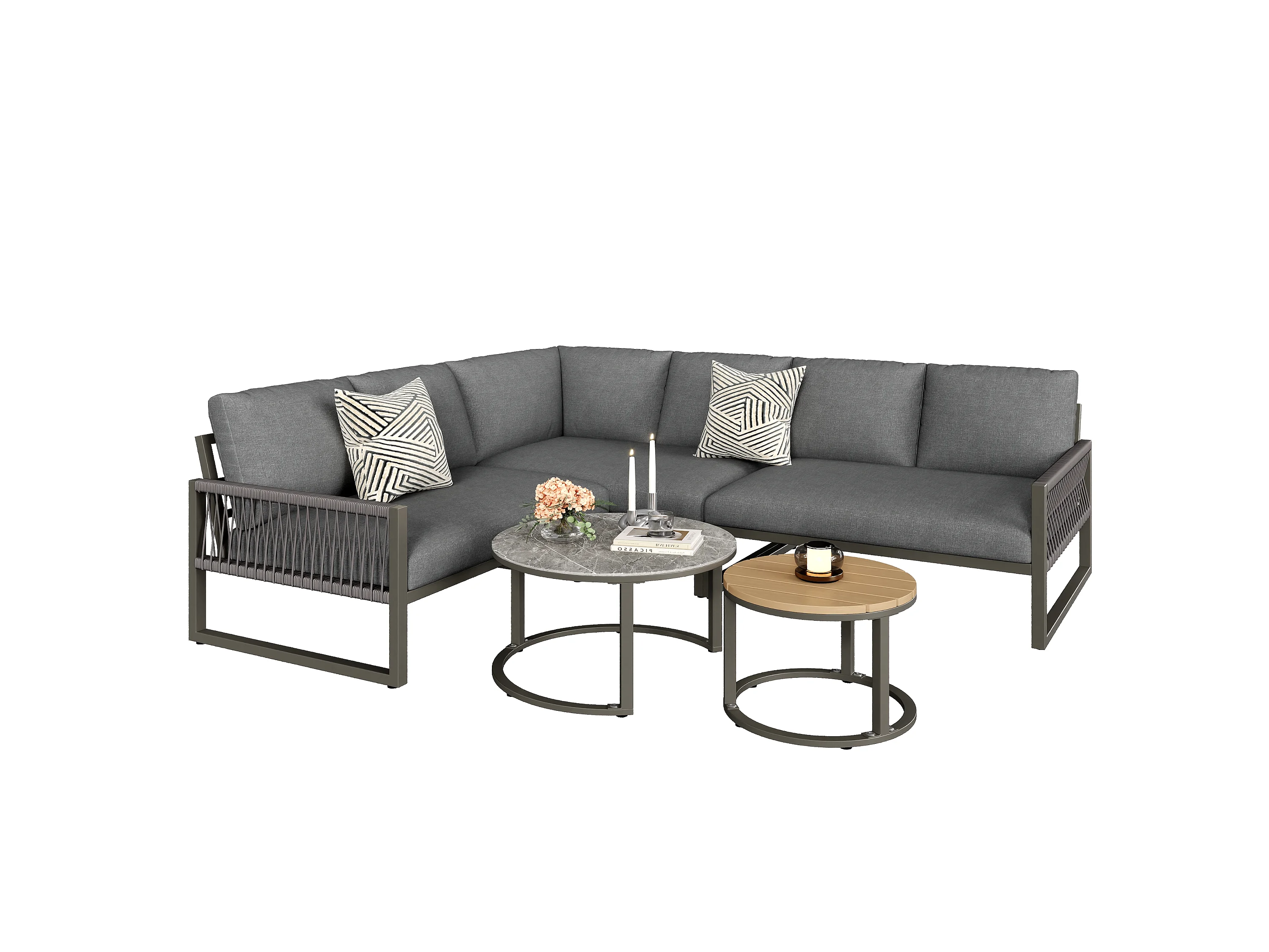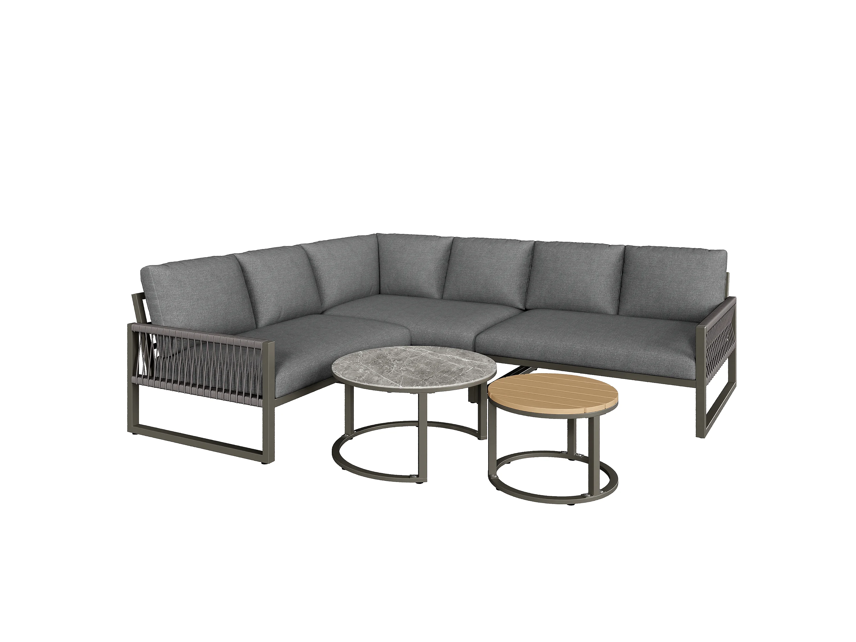 Salon de jardin moderne avec 3 canapés et 2 tables basses, gris