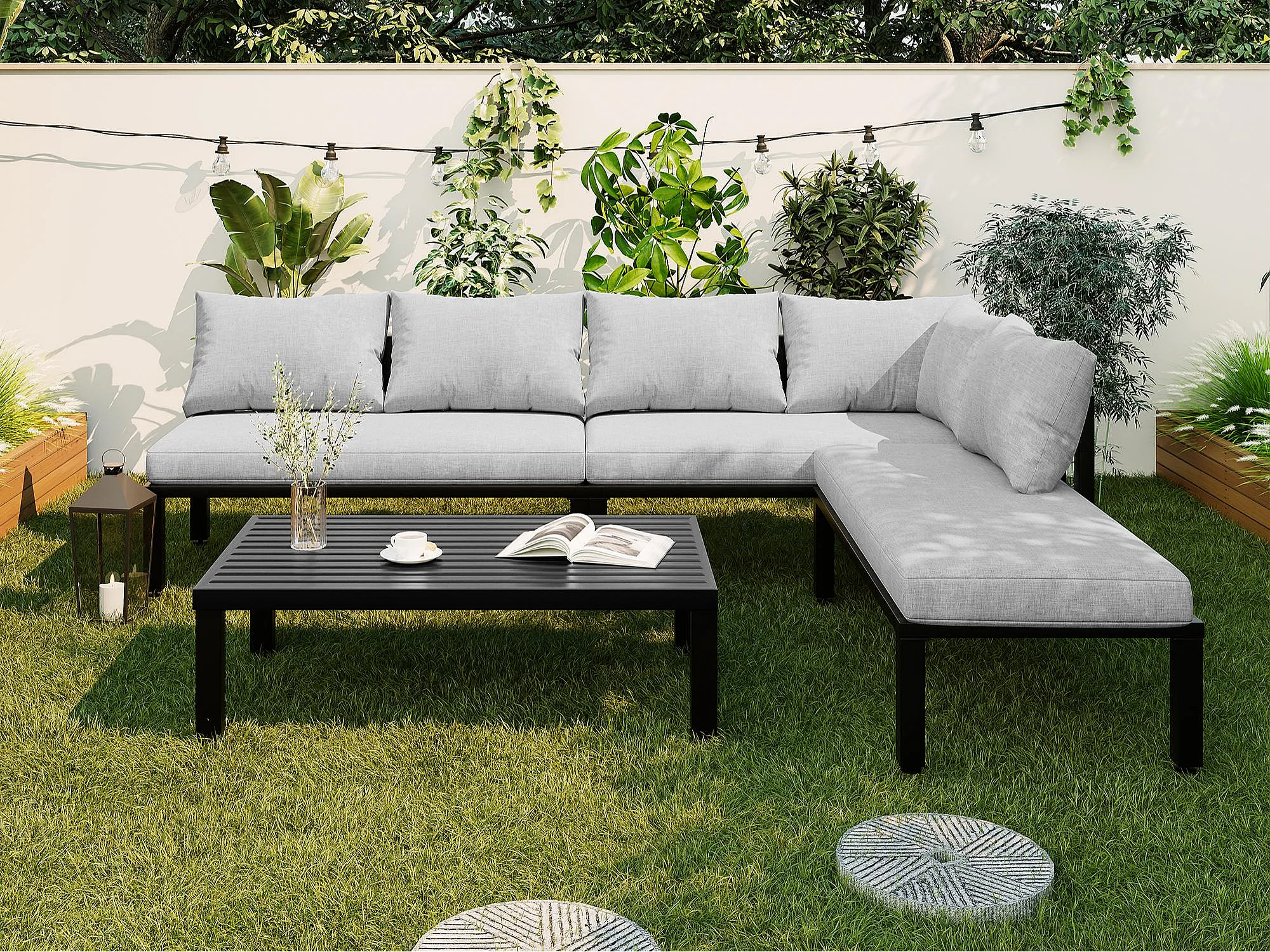 Salon de Jardin Modulable 6 Places avec Table Basse - Canapé d'Angle avec Dossiers Amovibles - Structure en Acier Galvanisé - Gris