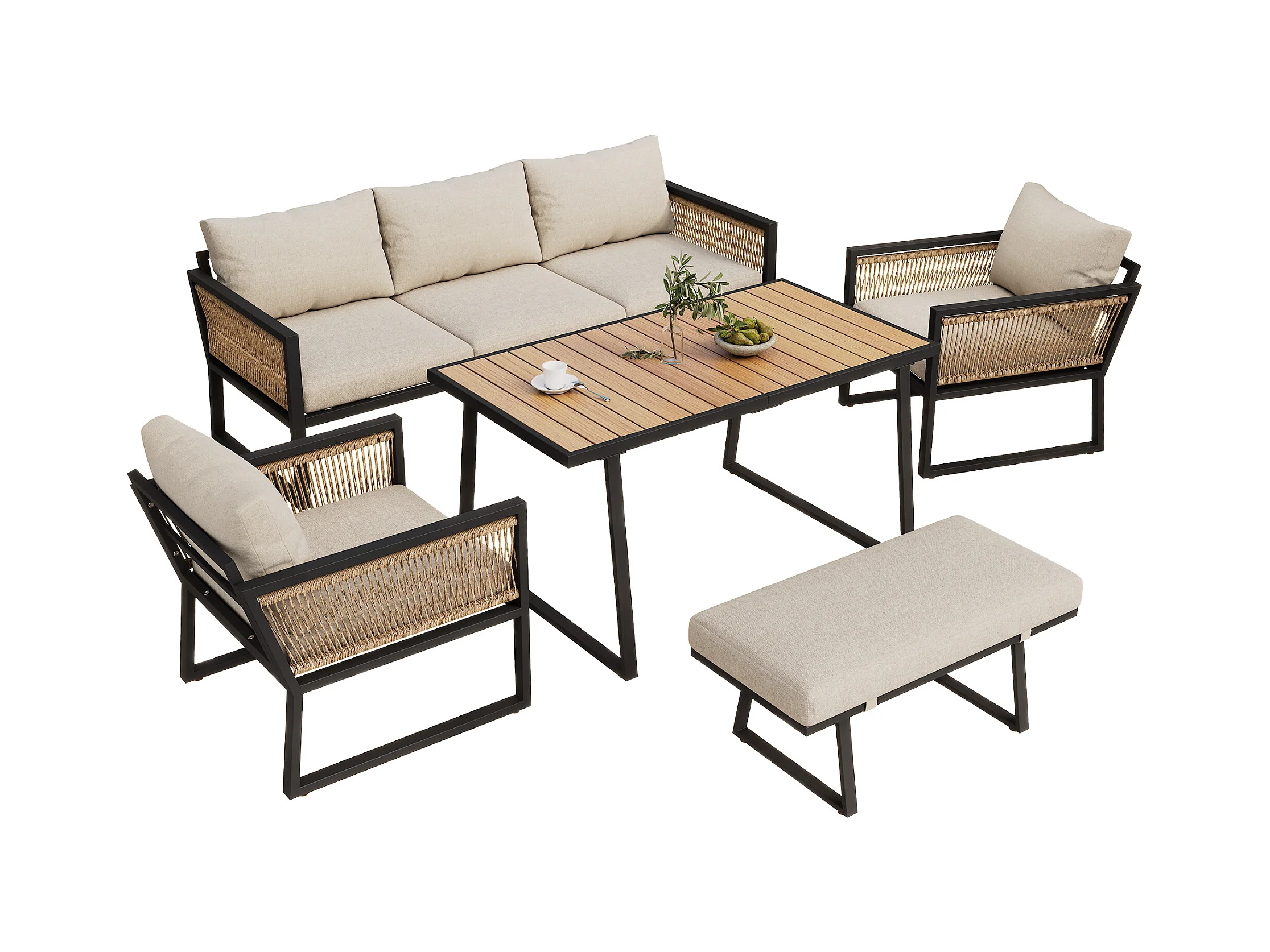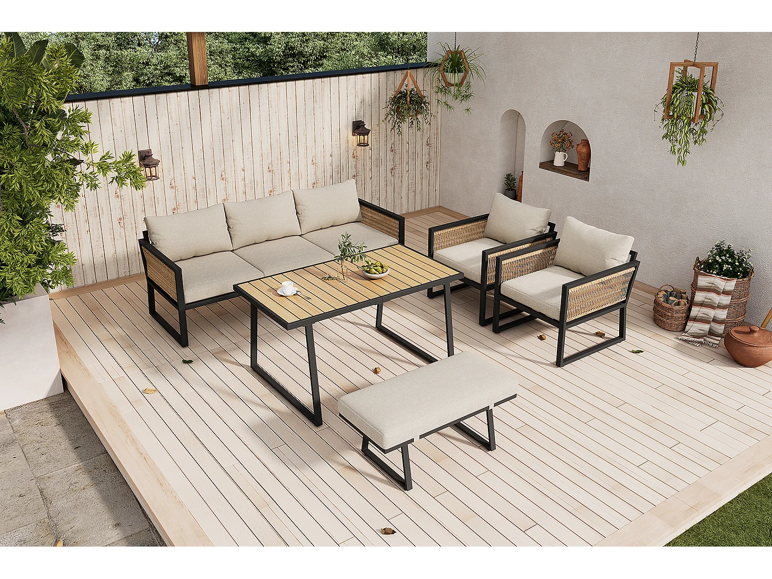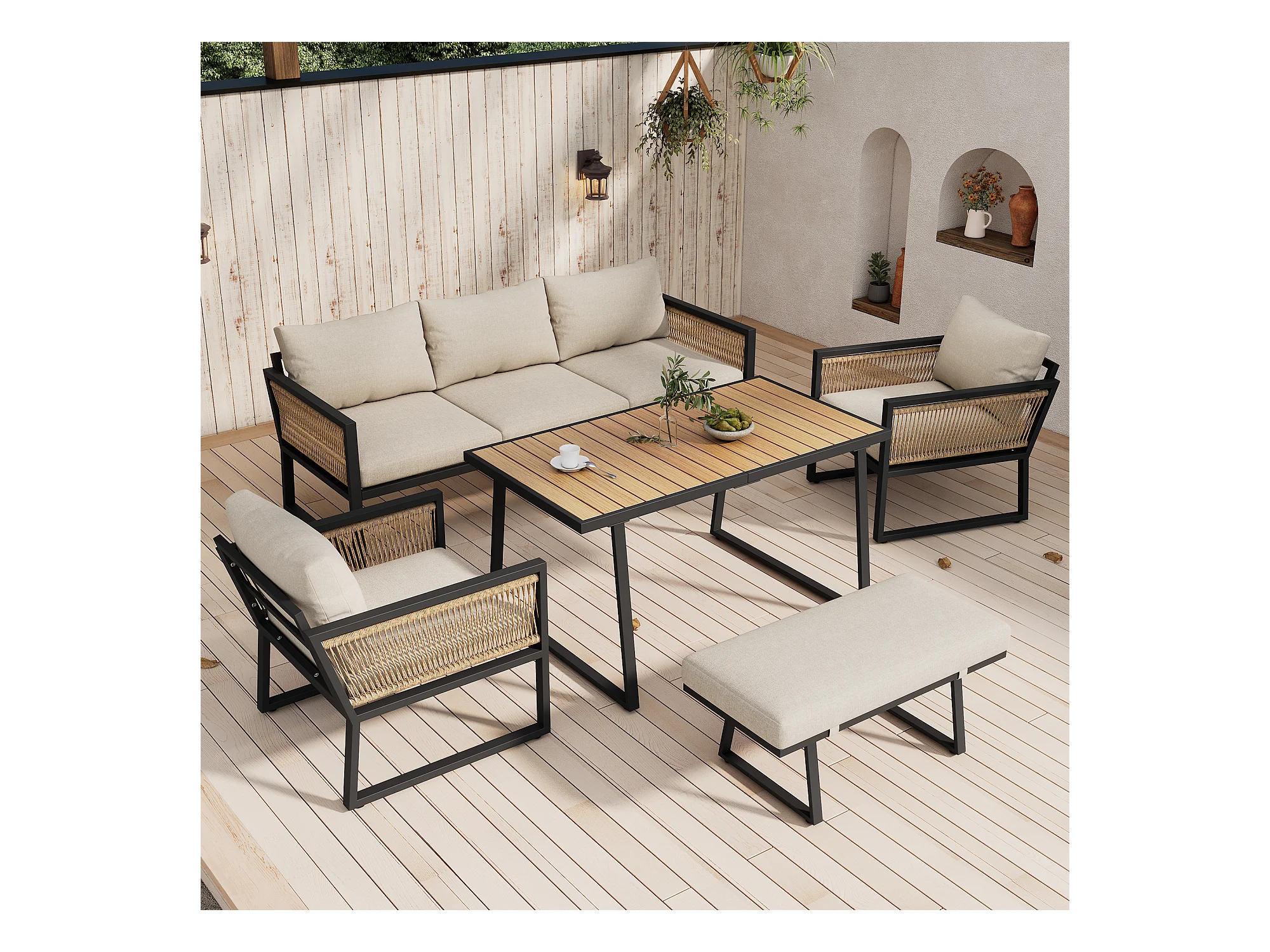 Salon de jardin modulable 6 places en acier galvanisé : 1 canapé 3 places + 2 fauteuils + 1 banc + table rectangulaire - Beige