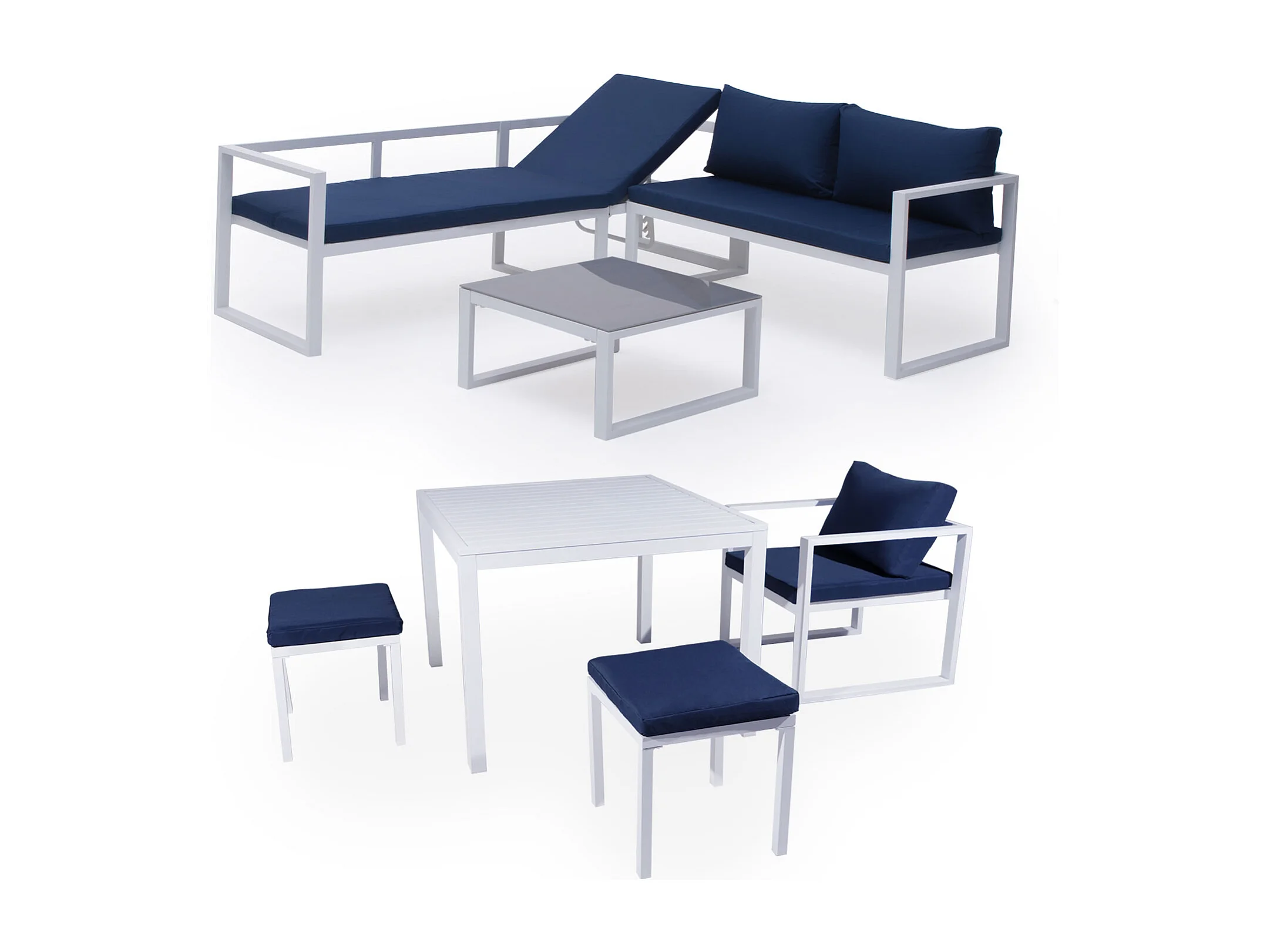 Salon de jardin modulable IBIZA en tissu bleu 7 places - aluminium blanc - HAPPY GARDEN