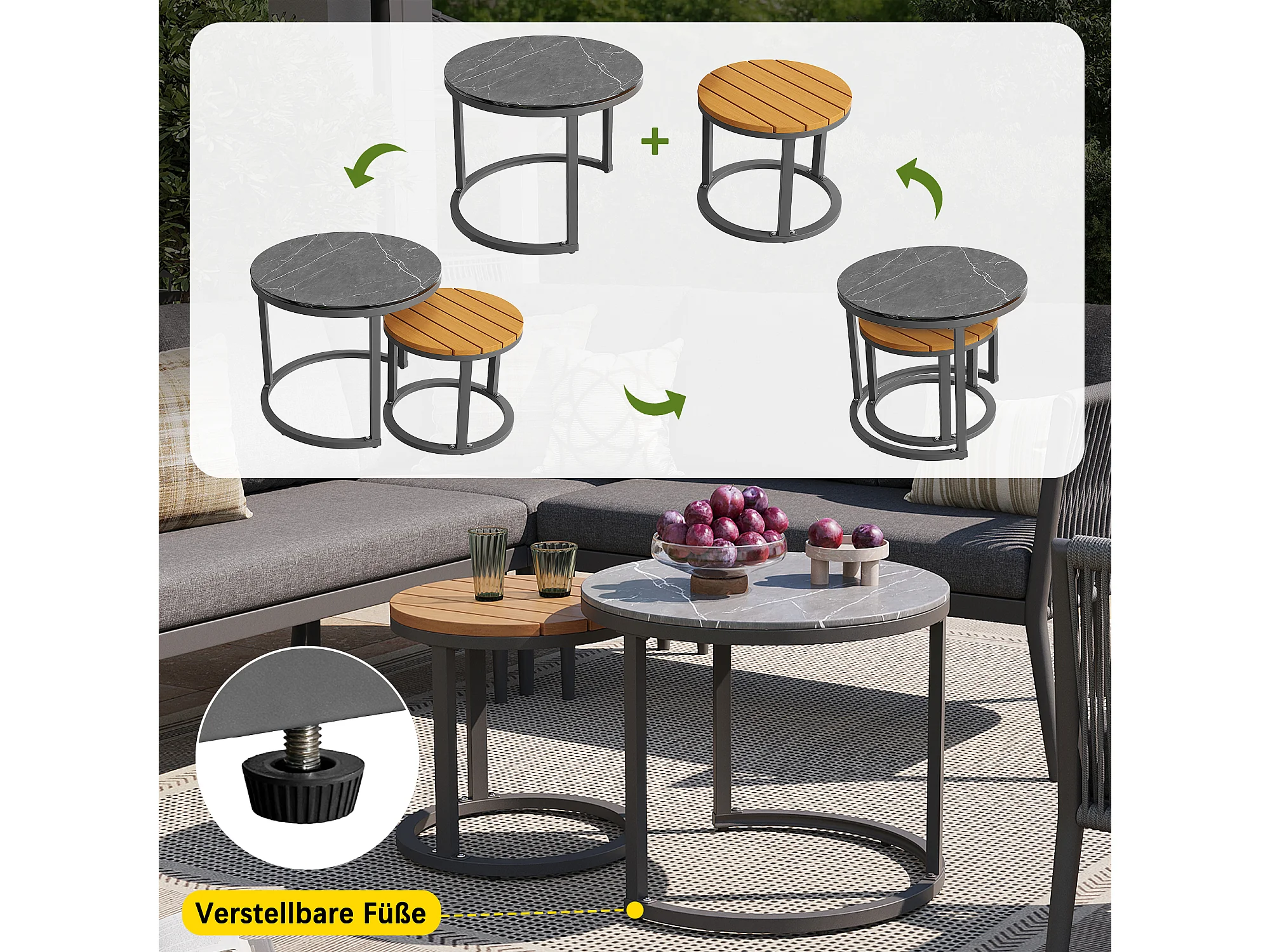 Salon de jardin pour 5-6 personnes, rotin PE avec banc et coussin imperméables, modulable, gris