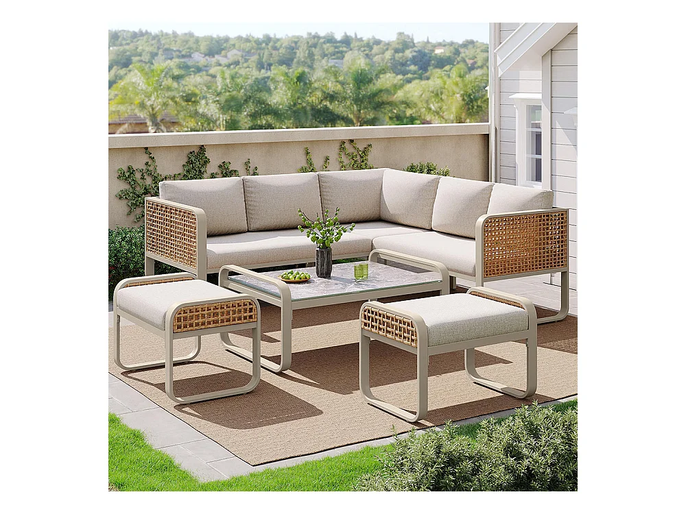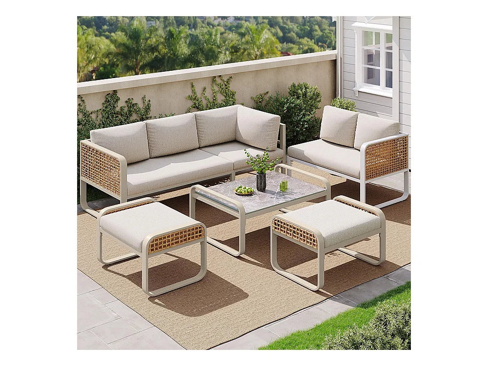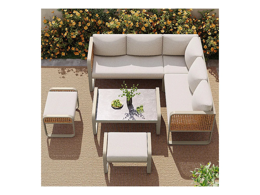 Salon de jardin pour 6-7 personnes, avec structure en fer galvanisé, pieds réglables, y compris tous les sièges et coussins,beige