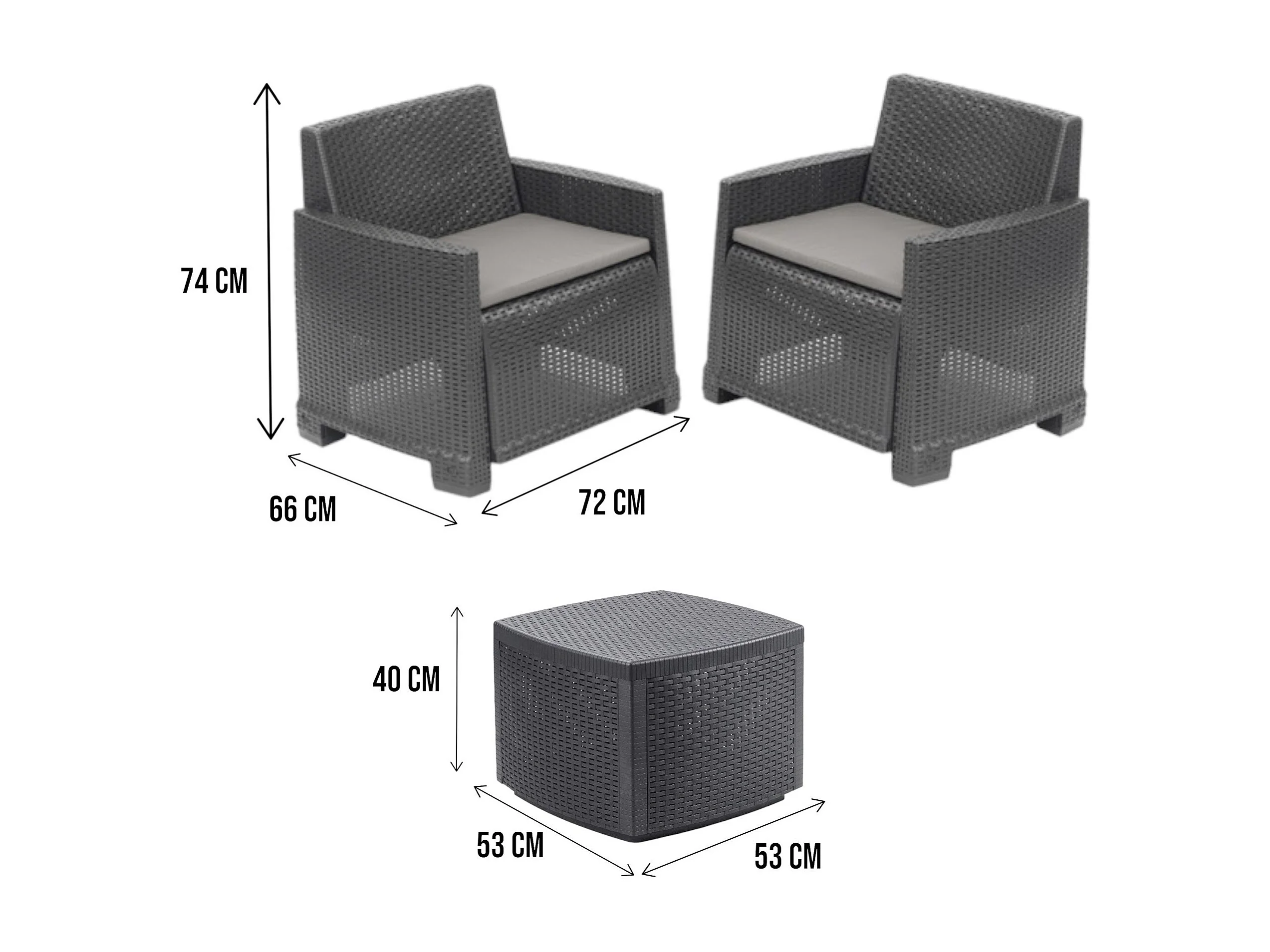 Ensemble de salon d'extérieur Dbelpan, Composition de jardin avec 2 fauteuils et 1 table de rangement, Effet rotin avec coussins, 100% Made in Italy, Anthracite
