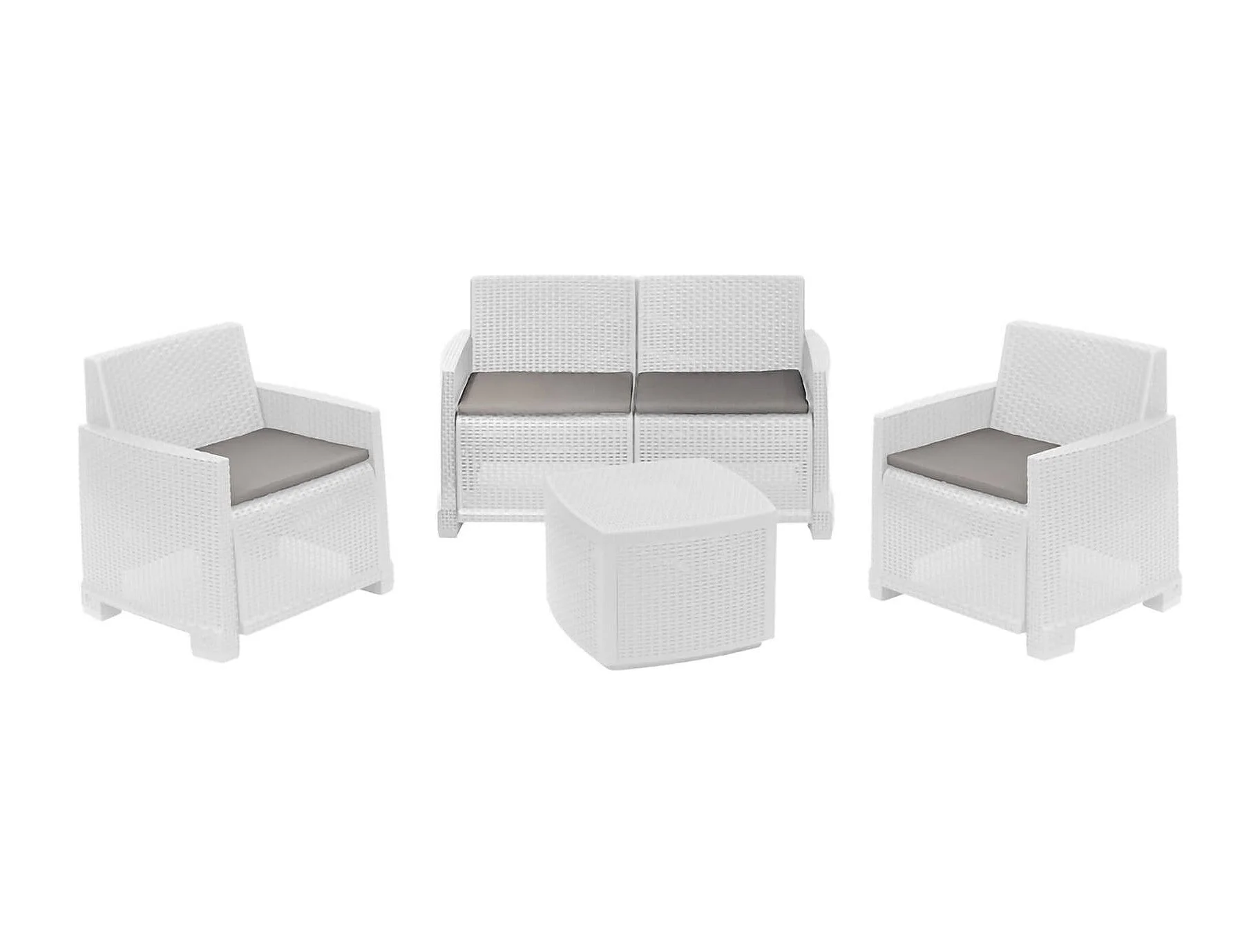 Salon d'extérieur Dbalestrer, Ensemble de jardin avec 2 fauteuils, 1 canapé et 1 table de rangement, Effet rotin avec coussins, 100% Made in Italy, Blanc