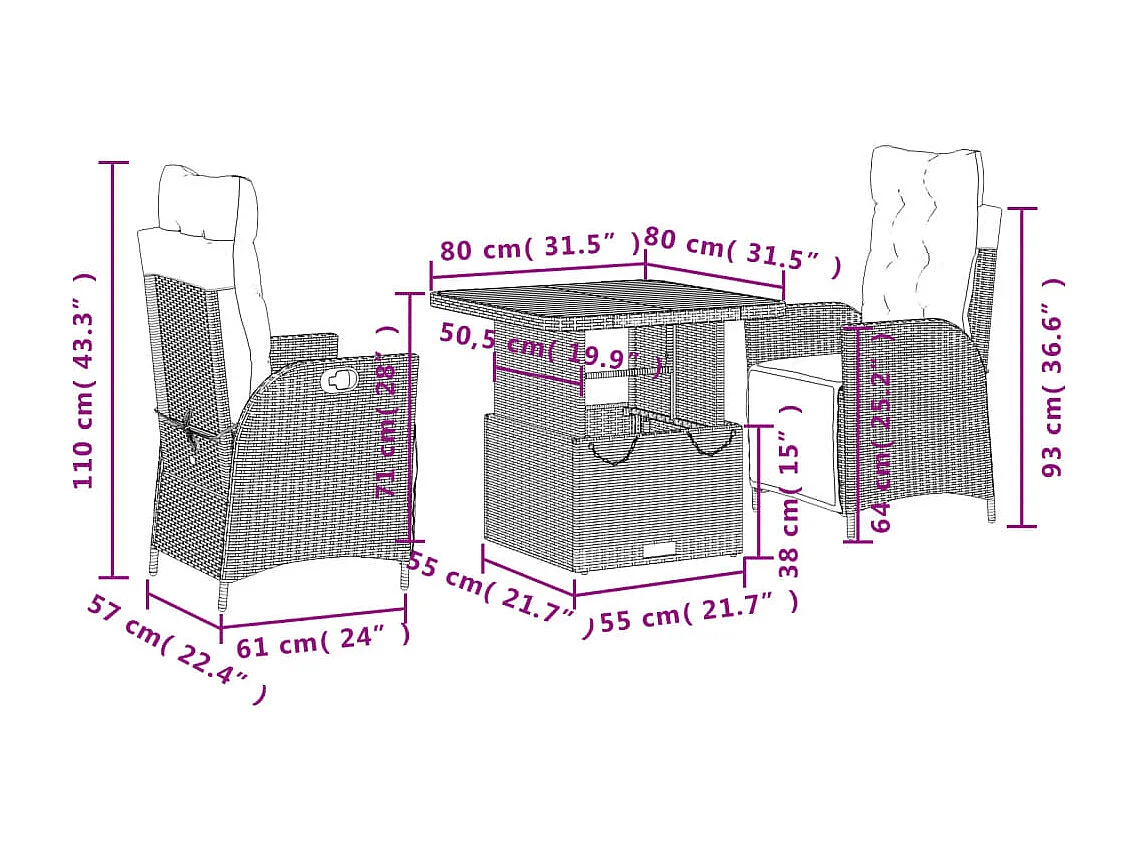 Toby Dean Ensemble à manger de jardin avec coussins 3 pcs Noir