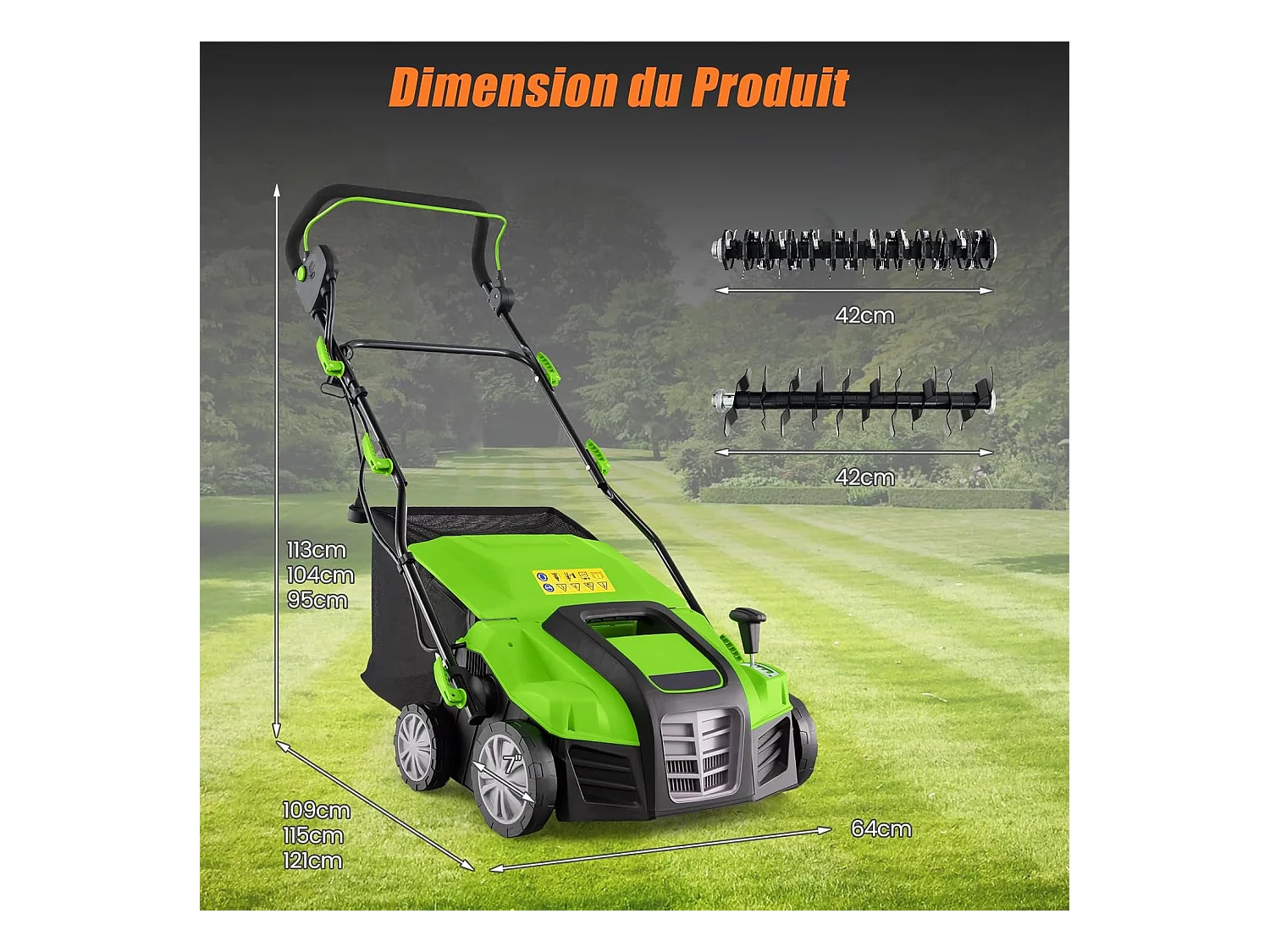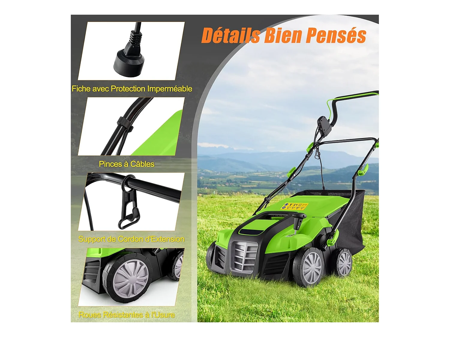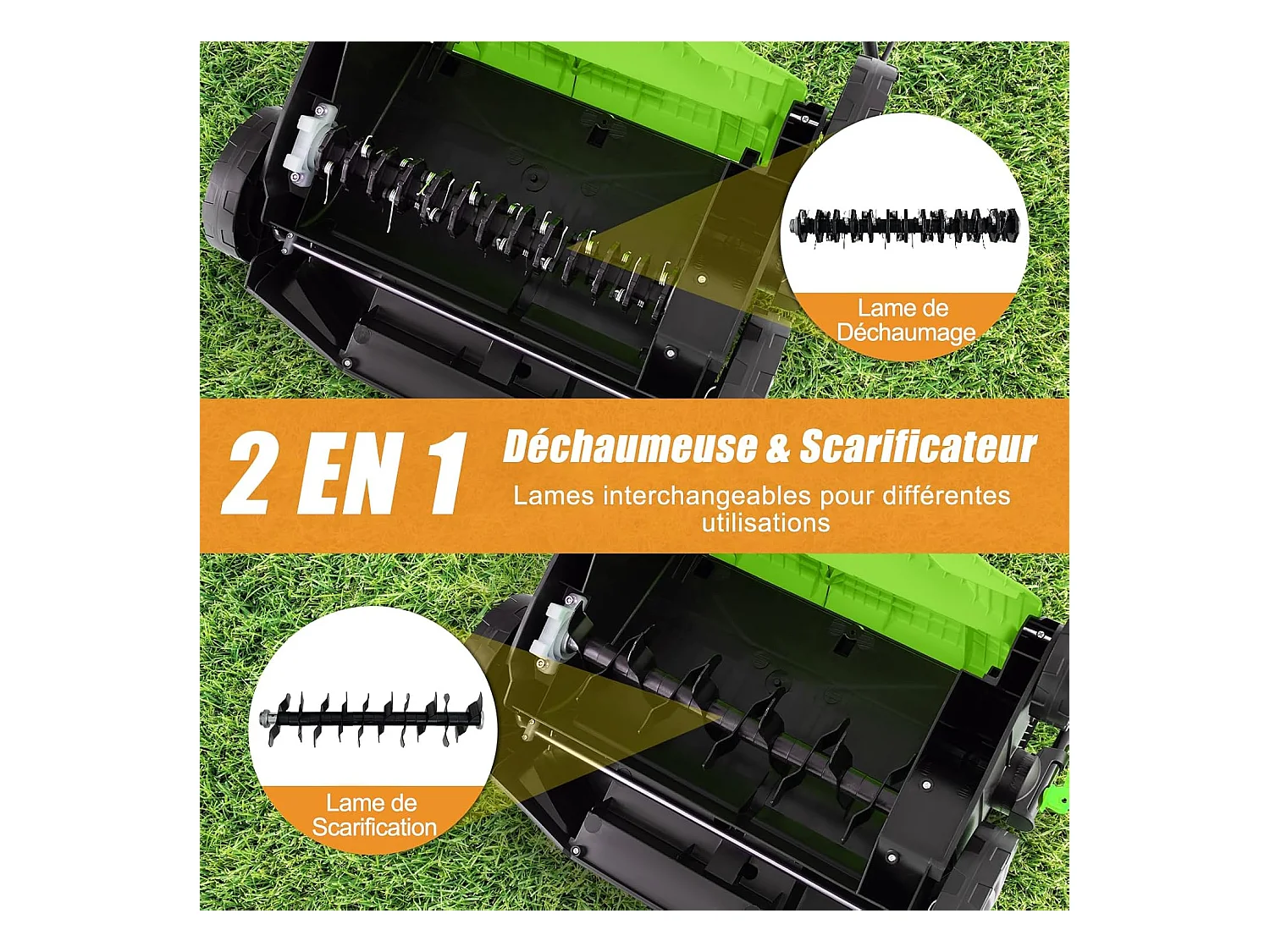 Scarificateur de Pelouse Électrique 2 en 1 de 15A, Aérateur Filaire avec 2 Lames, Double Interrupteur de Sécurité Réglable à 5 Positions (Vert)