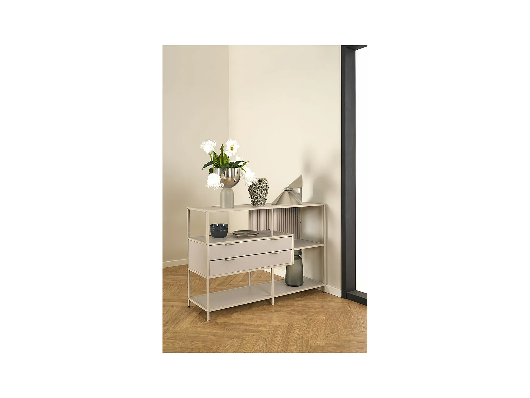 Seaford bibliothèque 2 tiroirs 3 étagères grises.