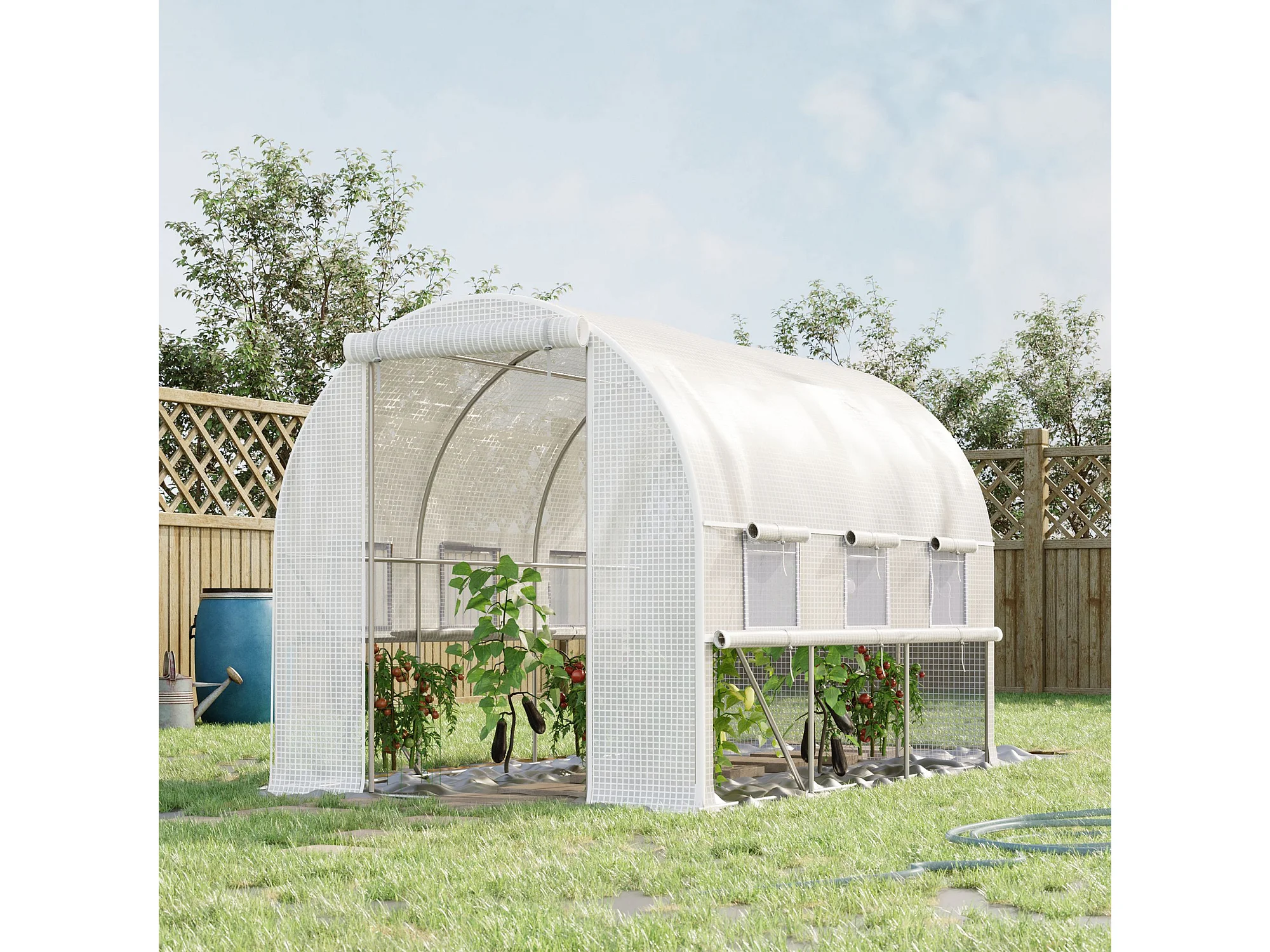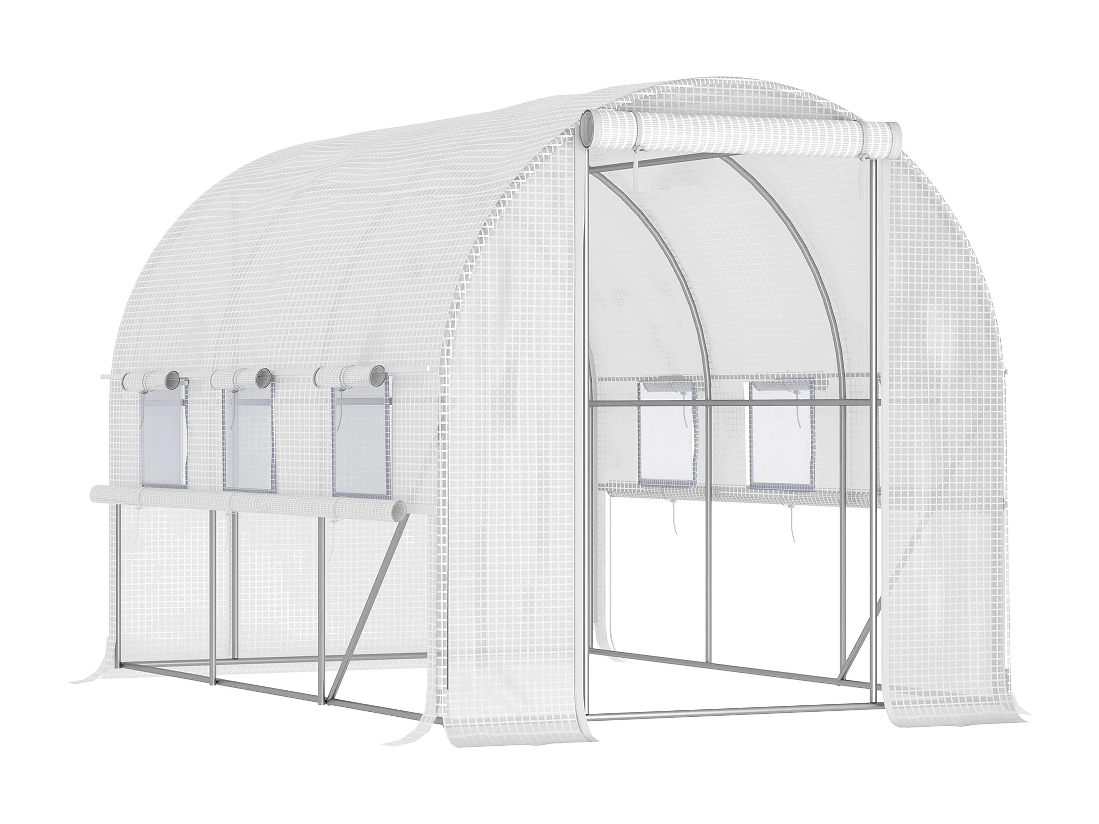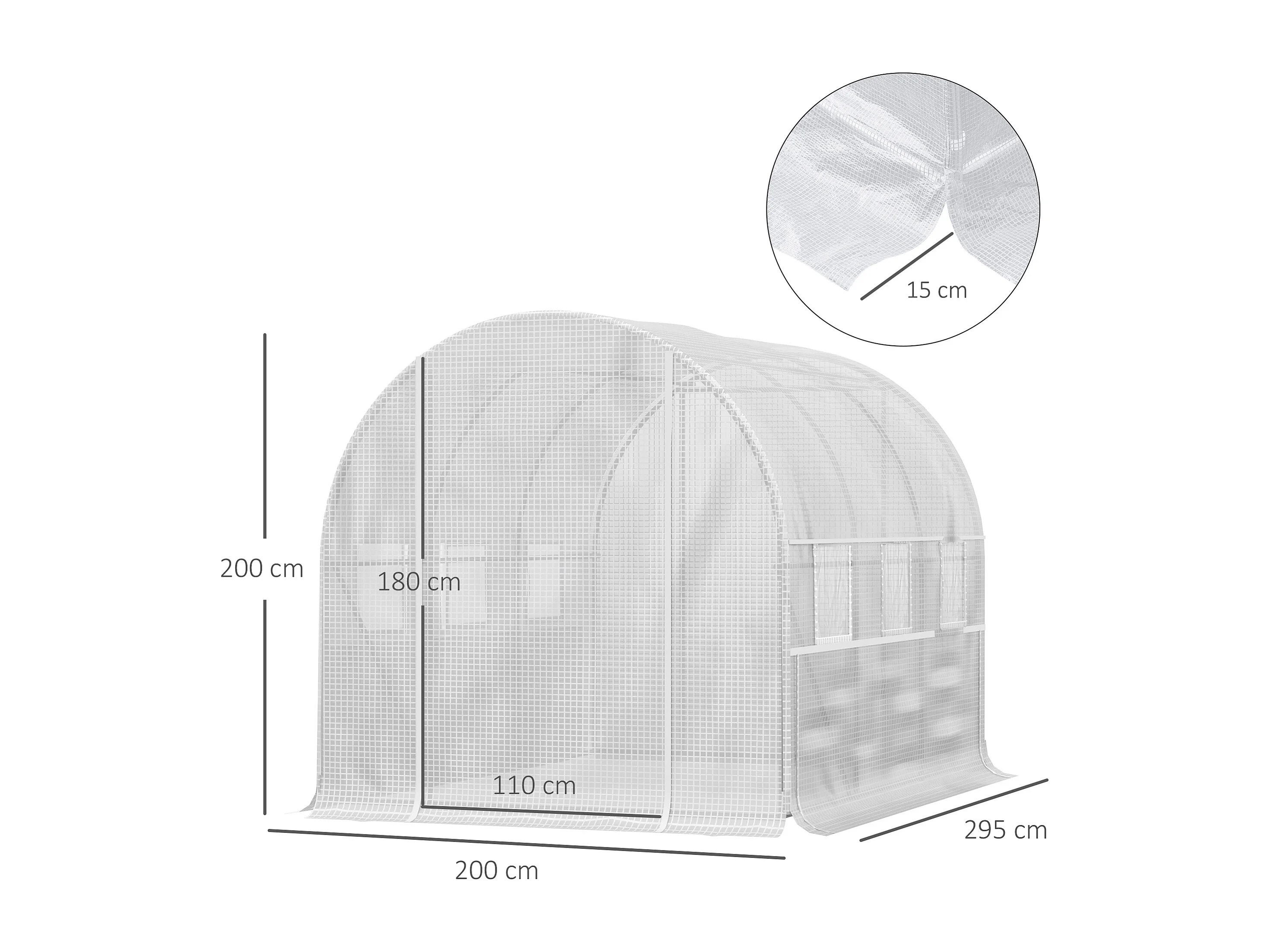 Serre tunnel avec fenêtres roulables, protection UV et vent, structure en acier, blanche (295x200x200 cm)