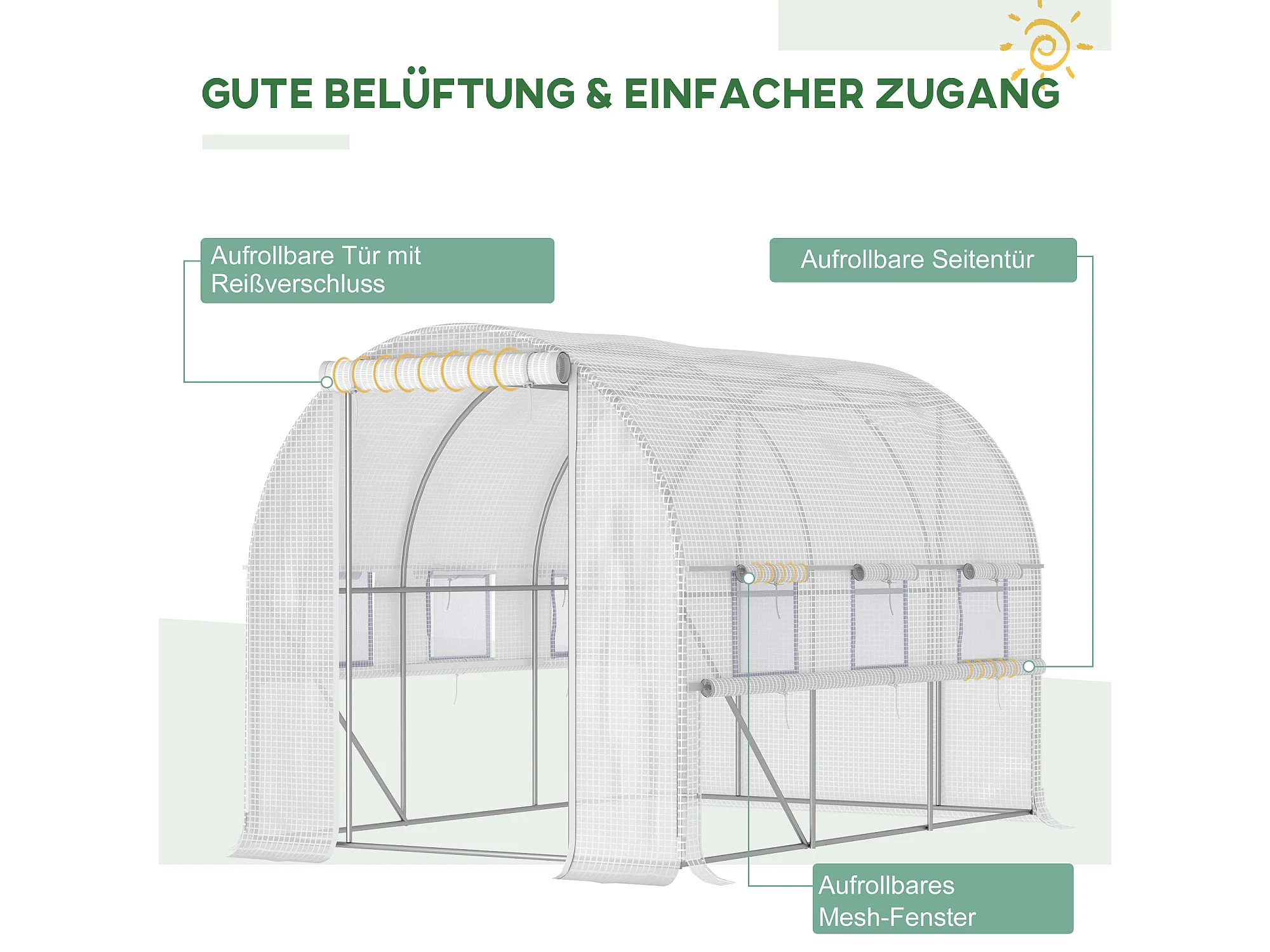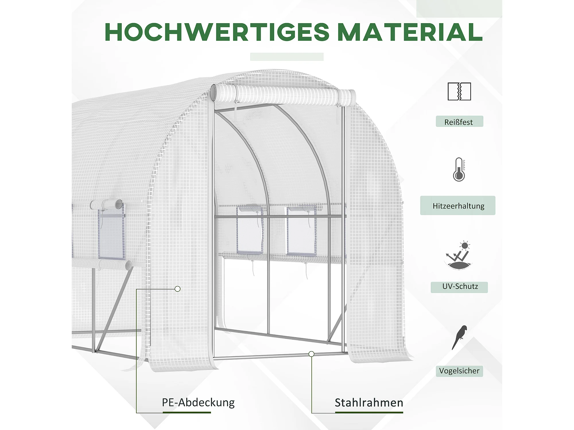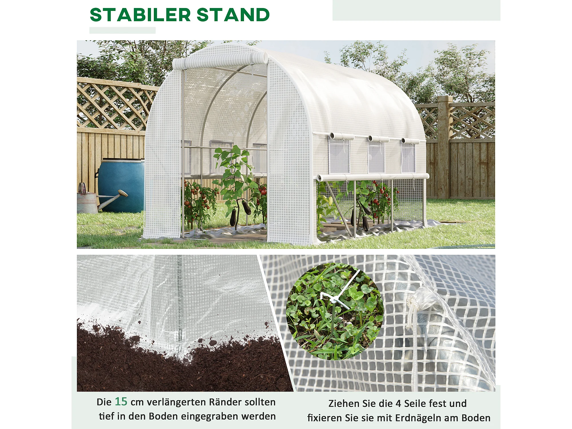 Serre tunnel avec fenêtres roulables, protection UV et vent, structure en acier, blanche (295x200x200 cm)