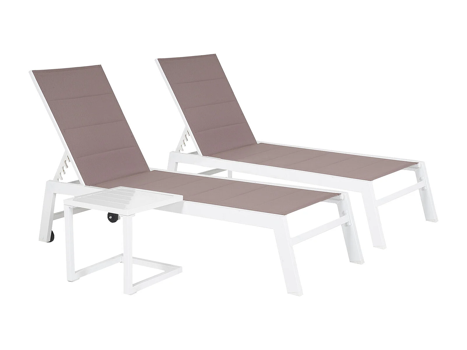 Set 2 bains de soleil et table d'appoint BARBADOS en textilène taupe - aluminium blanc - HAPPY GARDEN