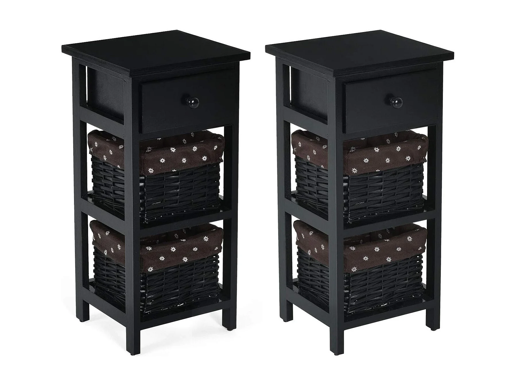 Set de 2 Table de Chevet Table de Nuit en Bois de Paulownia avec 1 Tiroir et 2 Panier d'Osier Amovible Style Chic Vintage Rustique Campagnard Noir