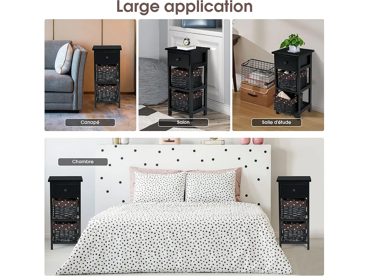 Table de Chevet, Table de Nuit en Bois de Paulownia avec 1 Tiroir et 2 Panier d'Osier Noir