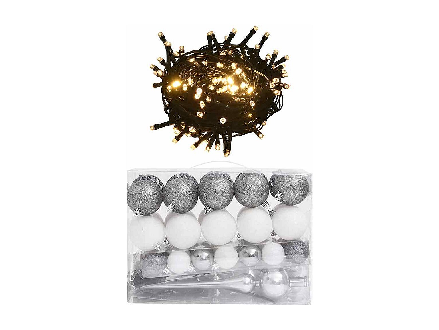 Set de boules de Noël avec pic et 150 LED 61 pcs Blanc et gris